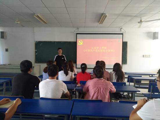 9月19日上午,自然人文研究生党支部全体成员在公司实验楼201教室集体学习新修订的《中国共产党纪律处分条例》,本次学习会由自然人文研究生党支部书记解进飞主持并领学。