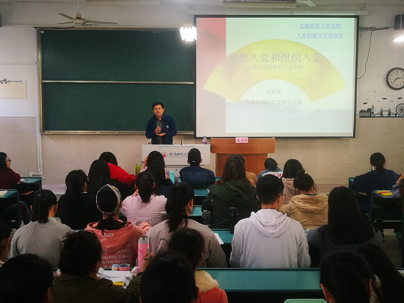 台启权以鲁迅与陈独秀两位历史人物作为切入点,与学员们展开精彩的互动,并以此教育学员们“入党是一生的事业”,要“端正入党动机,实现精神入党”,做一名“理性的入党积极分子”。随后,台启权阐述了“思想入党”的重要意义和要求,并以焦裕禄和孔繁森两位优秀共产党员举例,鼓励学员们牢记党“全心全意为人民服务”的宗旨,升华理想信念,做好模范带头作用。他从思想入党的意义、思想入党要求等方面为大家详细讲解了思想入党的重要性。最后,台启权主要讲授组织入党中关于发展党员的基本要求以及入党手续等基本入党程序,指出预备党员的教育、考察和转正十分重要。他强调,要严把发展党员的十六字基本要求:控制总量、优化结构、提高质量、发挥作用,以保证党员的质量,做好党员发展工作。