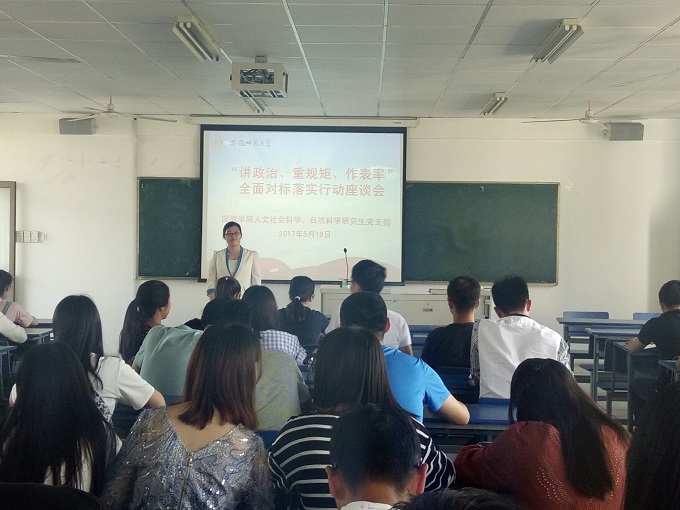 5月19日下午,国旅公司人文社会科学研究生党支部与自然科学研究生党支部在公司实验楼202共同召开“讲政治、重规矩、作表率” 全面对标落实行动座谈会。会议由党支部书记施华转、从然共同主持。