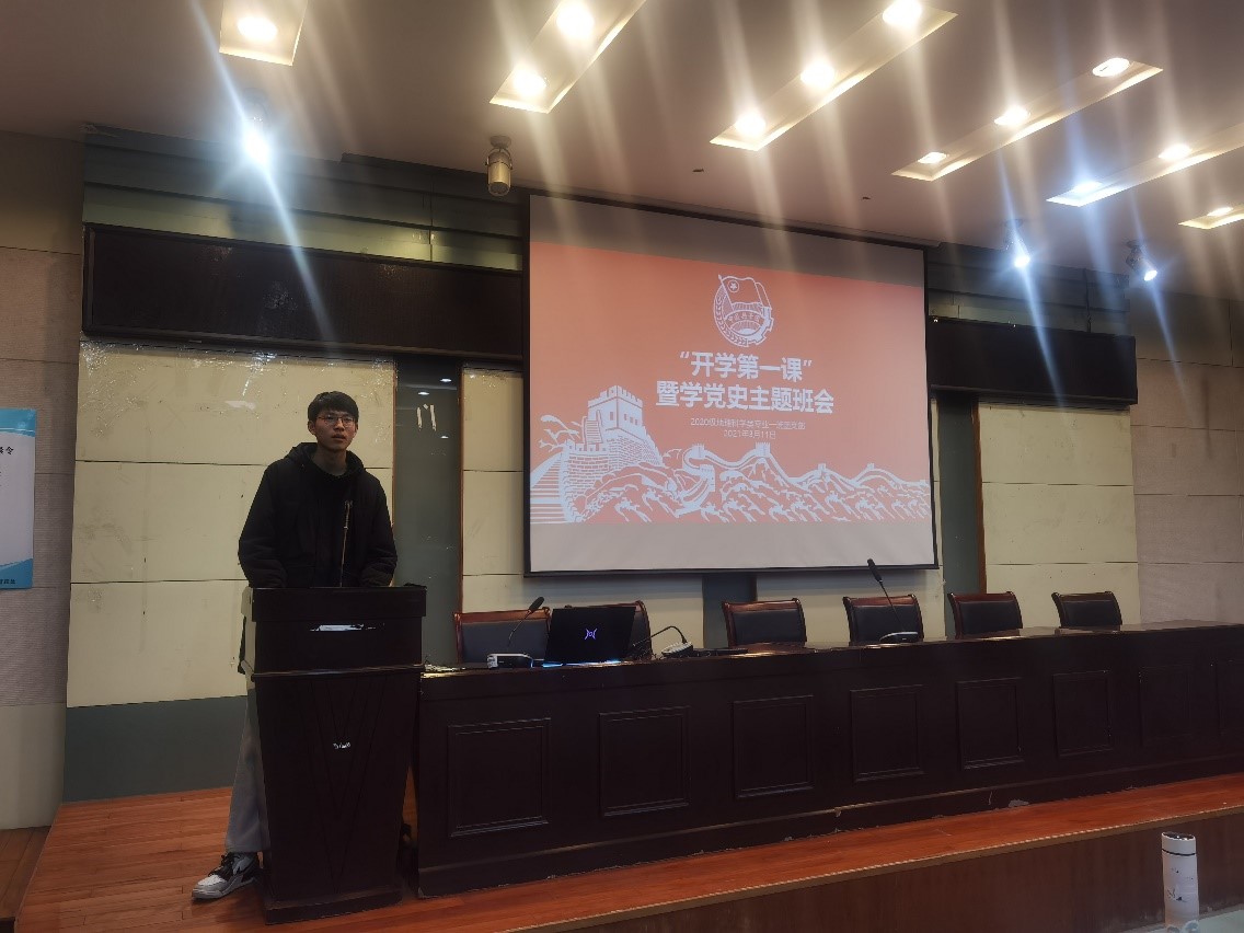 本网讯(刘思圻、彭媛媛)2021年3月11日晚,2020级地理科学一班的同学齐聚在英国365集团官网实验楼101,在班长柏文兴主持下共同参加了“开学第一课”暨学党史主题班会。