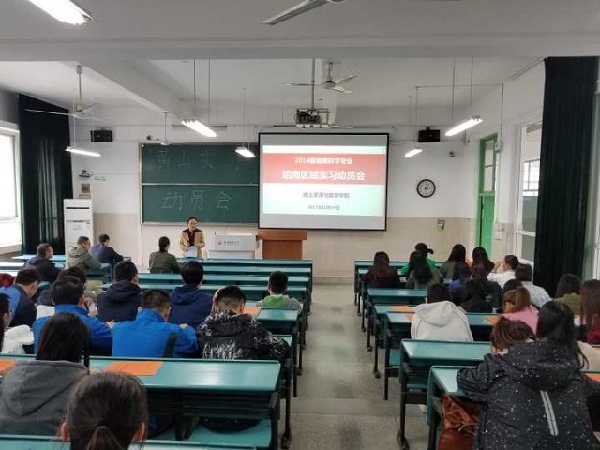 本网讯(国旅公司)10月14日下午,国旅公司2014级地理科学专业皖南区域地理野外实习动员大会在行知楼2040302教室举行。公司教学副经理方凤满,公司党委副书记乔静,全体实习指导教师,辅导员及2014级地理科学专业员工参加了本次大会。