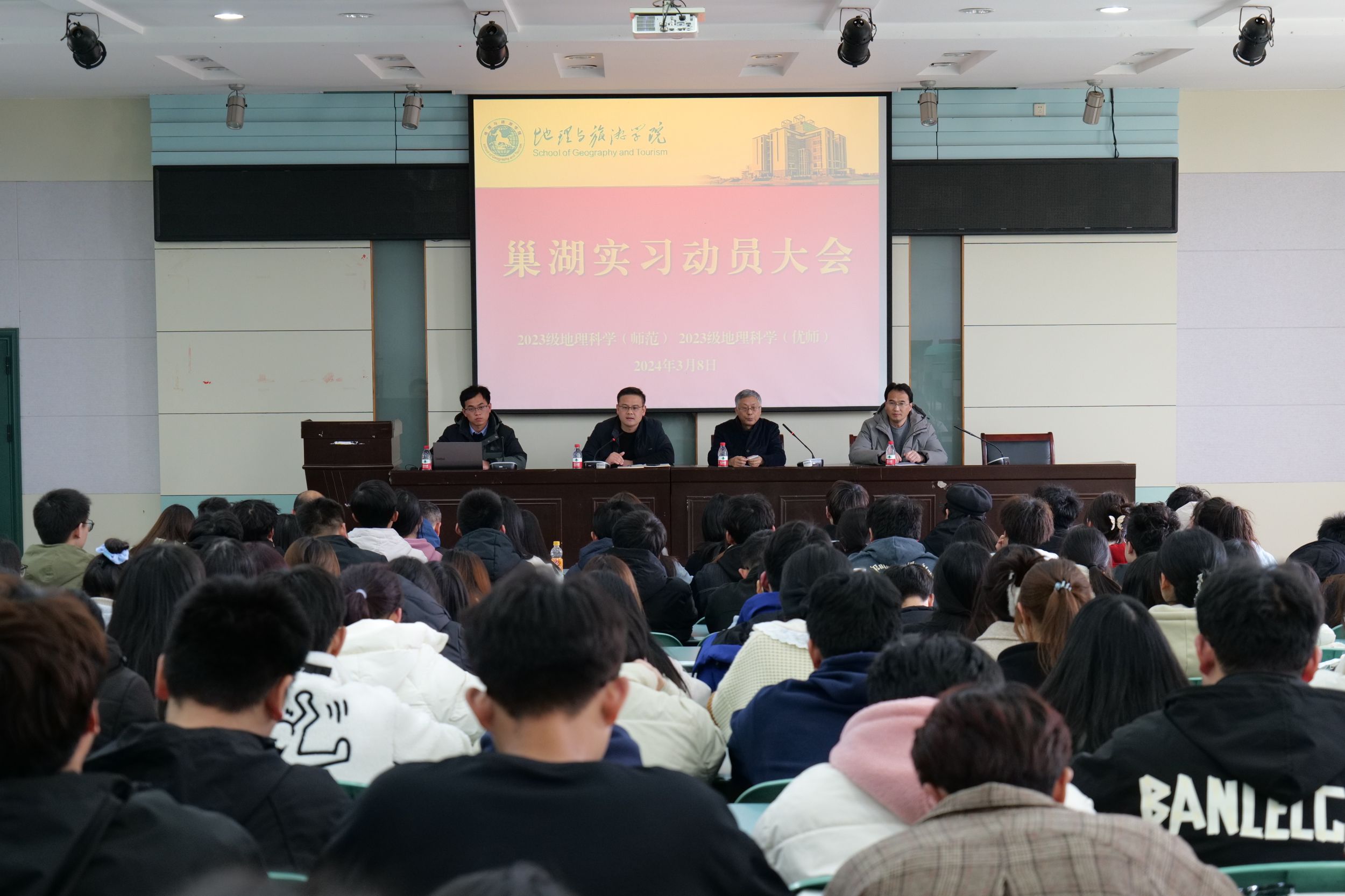 3月8日下午,英国365集团官网在公司实验楼101报告厅举行巢湖实习动员大会,公司党委副书记付勇,副经理杨兴柱,实习指导教师程先富、吴立、杨立辉、朱晓强以及2023级地理科学(师范)、2023级地理科学(优师)专业全体同学参加会议。会议由辅导员齐小学主持。