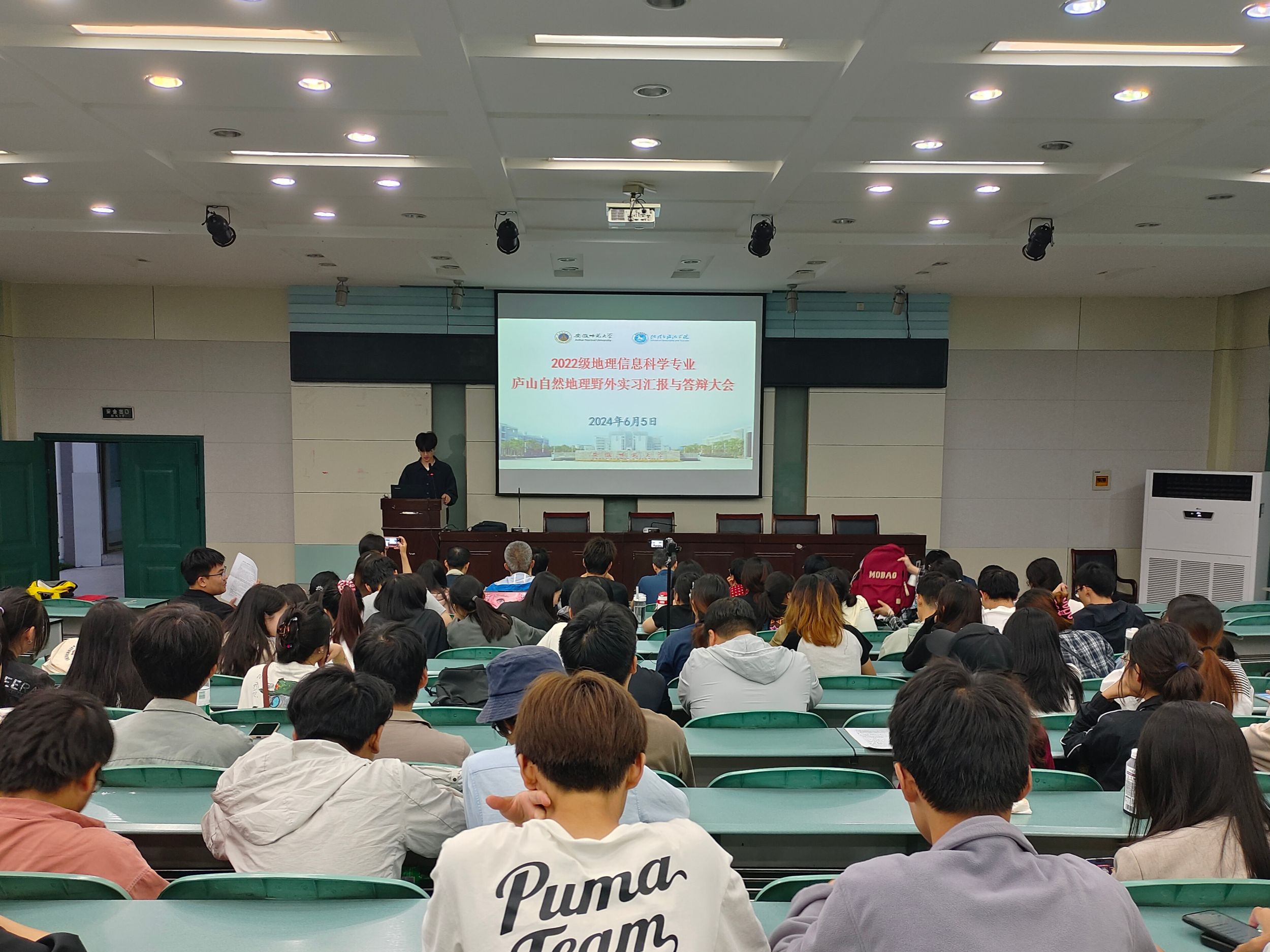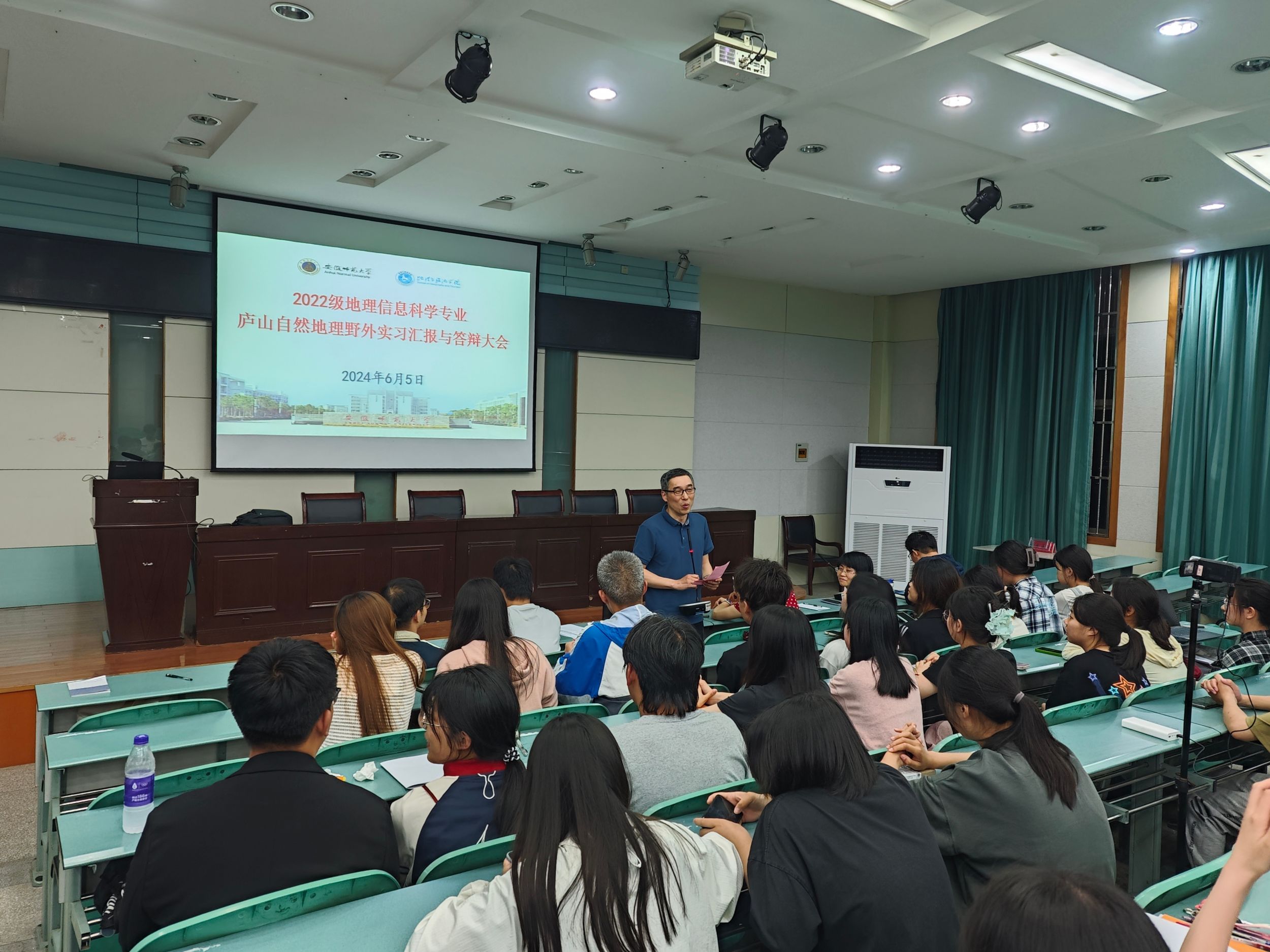 6月5日晚开展了2022级地理信息科学专业庐山地区自然地理野外实习汇报与答辩会。2022级地理信息科学专业全体同学参加,本次实习全体指导教师以及辅导员陈祥云担任评委。通过实习总结视频,同学们回顾了此次实习的生动画面与珍贵瞬间。随后,五个小组代表分别上台对庐山实习的内容进行了总结汇报与答辩。在大会的尾声,胡春生对本次庐山实习进行了总结与点评,认为同学们不仅学到了专业知识,更收获了宝贵的实践经验与人生感悟;赞扬了同学们在实习中的表现,并感谢所有参与到本次庐山实习中相关人员的付出。