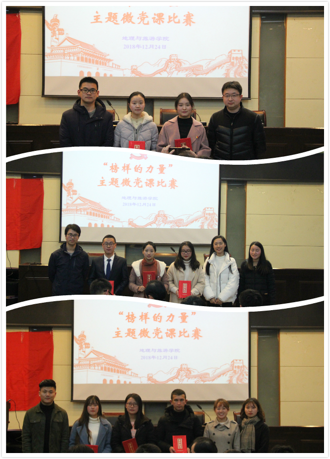 九位选手们紧紧围绕主题,结合身边的人和事阐述自己对榜样力量的理解。他们选取的榜样人物从建党初期涌现的革命先辈优秀党员李大钊、何叔衡到当代带领群众致富的“感动新疆”十大人物优秀党员李元敏,从县委书记的榜样焦裕禄到我们身边教书育人的榜样青年教师吴立,贯穿了九十多年的建党历史。其中,2015级旅游管理专业的胡思旋以断肠明志的陈树湘为例进行授课,讲到陈树湘誓为中国革命流尽最后一滴血的感人事迹时,现场观摩的师生深深地被陈树湘同志的革命大无畏精神感动;胡思旋在自己的微党课结束前与大家分享自己的授课感悟:生是人的本能,而信仰却可以使人超越本能,实现自己的人生追求;党员要有坚定的信仰,信仰马克思主义和中国共产党;党员要向榜样学习,坚持学而信、学而思、学而行,坚定理想信念。