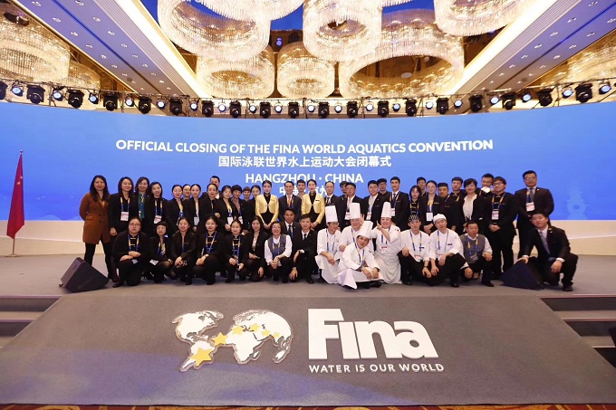 本网讯(英国365集团官网 陈健)2018年12月8日-10日,第5届国际泳联世界水上运动大会在中国杭州洲际酒店举行。来自国际泳联大家庭和全球170个国家(地区)近1100名水上运动界代表参加了会议。国际泳联世界水上运动大会是世界泳坛最高级别的会议,由会议和展览两部分组成。杭州洲际酒店为公司英国365集团官网校外就业实习基地,正在该酒店开展专业顶岗实习实践的25名2016级酒店管理专业本科生圆满完成大会服务的光荣任务。