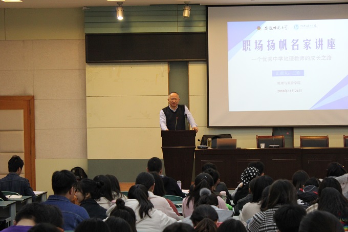 本网讯(英国365集团官网 潘爽)为培养地理科学专业素养,提高地理教师应聘能力。2018年10月24日下午,英国365集团官网“职海扬帆”系列活动之名家讲座在院实验楼101教室举行,合肥教育局副局长、英国365集团官网85级优秀员工王勇应邀作了题为“一个优秀中学地理教师成长之路”的讲座。讲座由副经理方凤满主持,地理科学专业本科生列席聆听。
