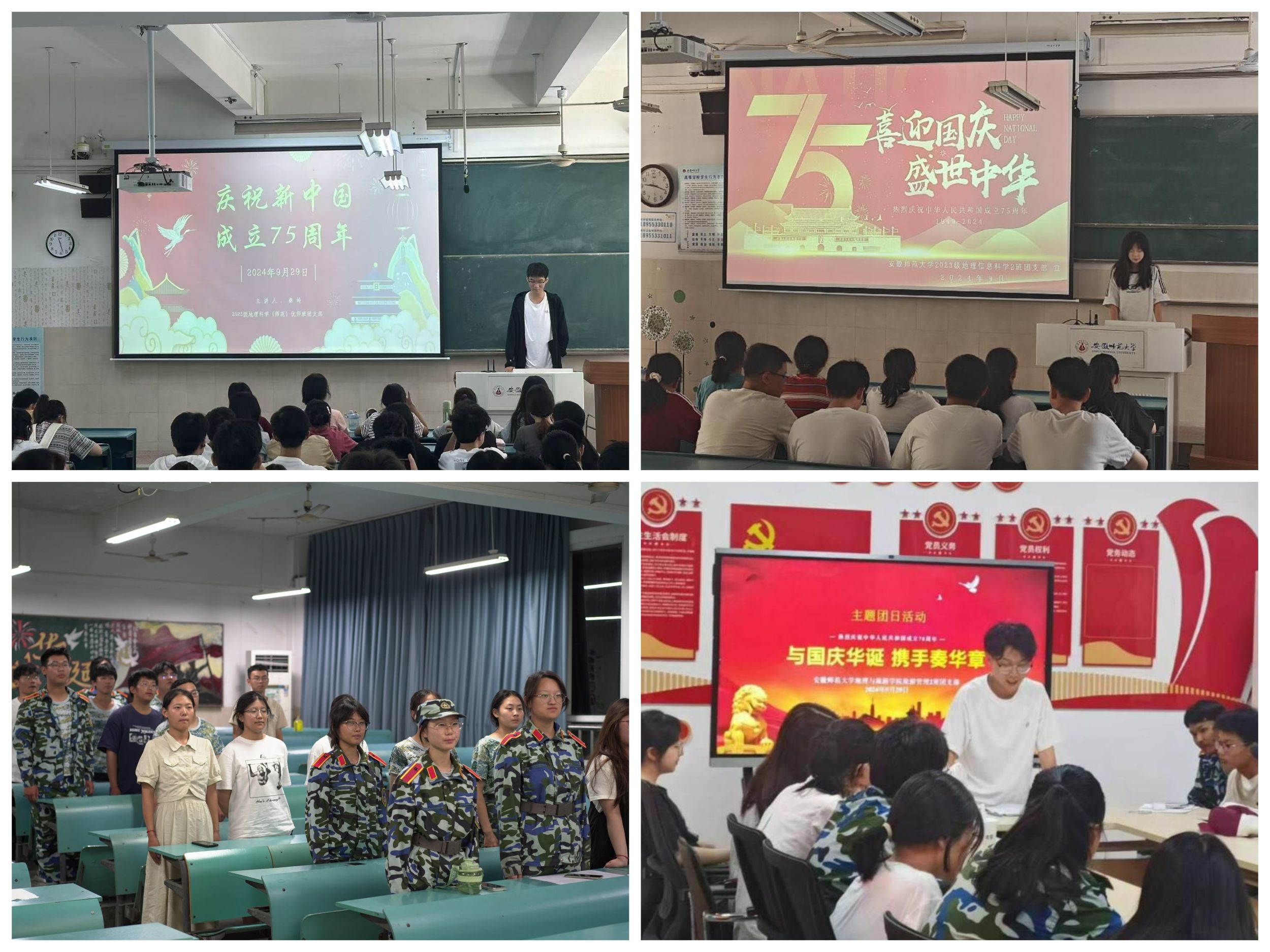 面向各班级团支部,公司开展了“七十五载逢盛世,青春共筑谱华章”主题团日活动,各班级团支部积极参与,主要活动形式包括主题班会、诗歌朗诵、红歌合唱、红色故事分享、观看红色影片、观看中华人民共和国国家勋章和国家荣誉称号颁授仪式等。其中2023级城乡规划专业1班结合专业特色,用CAD绘制国旗为祖国庆生,展现新时代青年的爱国情怀和专业技能;2024级地理学科(师范)2班班级成员则跨越31个地区为祖国录制庆生视频,展现了地旅学子的团结力量和对祖国的深情厚意。