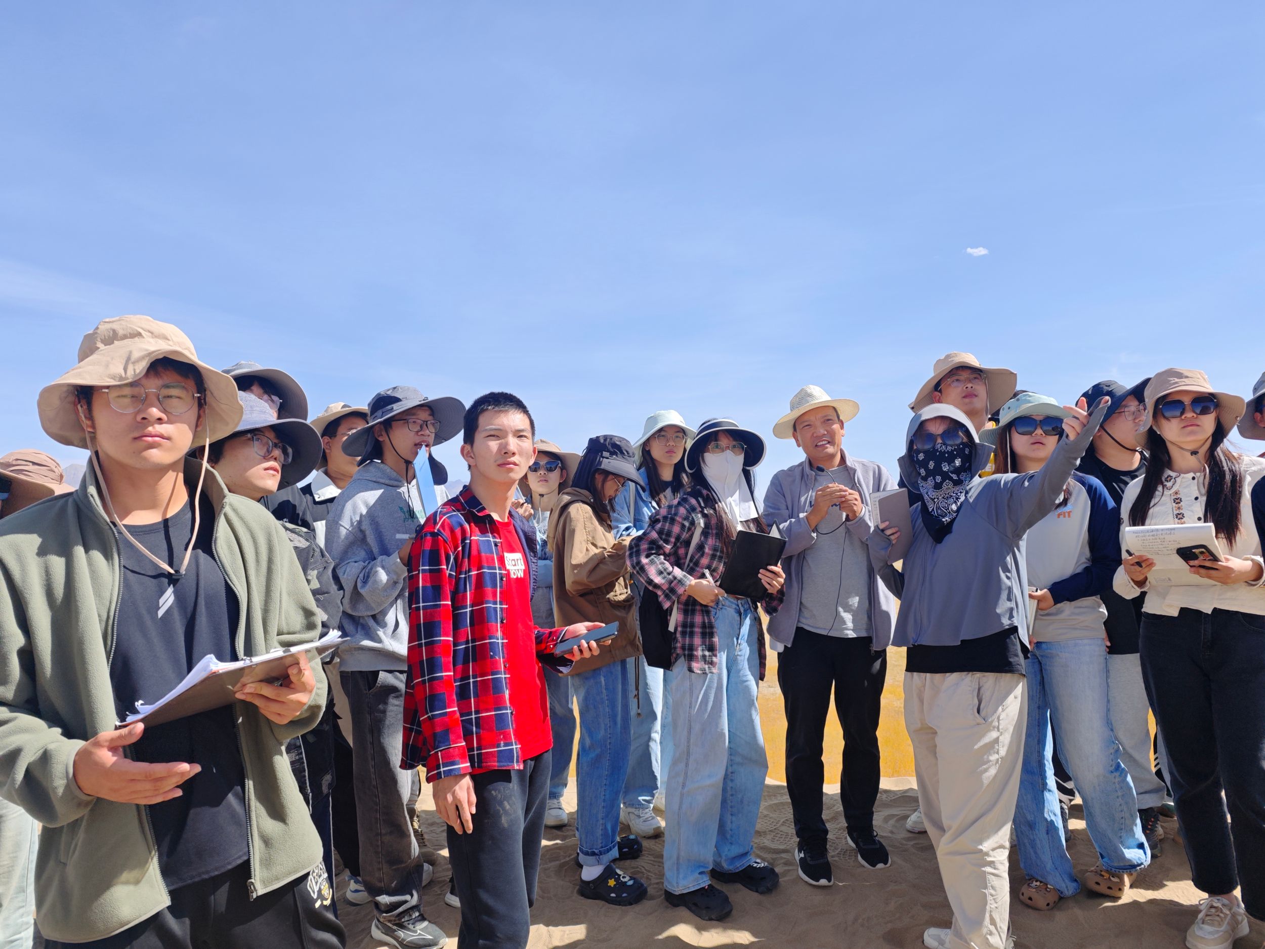 同学们在老师的带领下,穿行于茫茫戈壁与高山。在鸣沙山见证了“大漠孤烟直,长河落日圆”的壮观景象;在玉门关品味“羌笛何须怨杨柳,春风不度玉门关”的思乡之情;在察尔汗盐湖体验了“天空之镜”般的奇幻景观……在驻足于大自然壮美景色的同时,伴随着老师的讲解,同学们将书本理论与野外实践紧密结合,对西北地区典型地质地貌、水文气象、土壤结构和植被特征等方面进行了全面深入的调查研究。实习期间,程先富带领员工们挖青海地区高原土壤剖面,细致分析了青海地区的土壤组成,并进行了土壤采样。杨立辉则细致介绍了七彩丹霞地貌的成因,鸣沙山月牙泉的形成原因,以及雅丹地貌的形成条件,并引导员工采集风棱石样本。