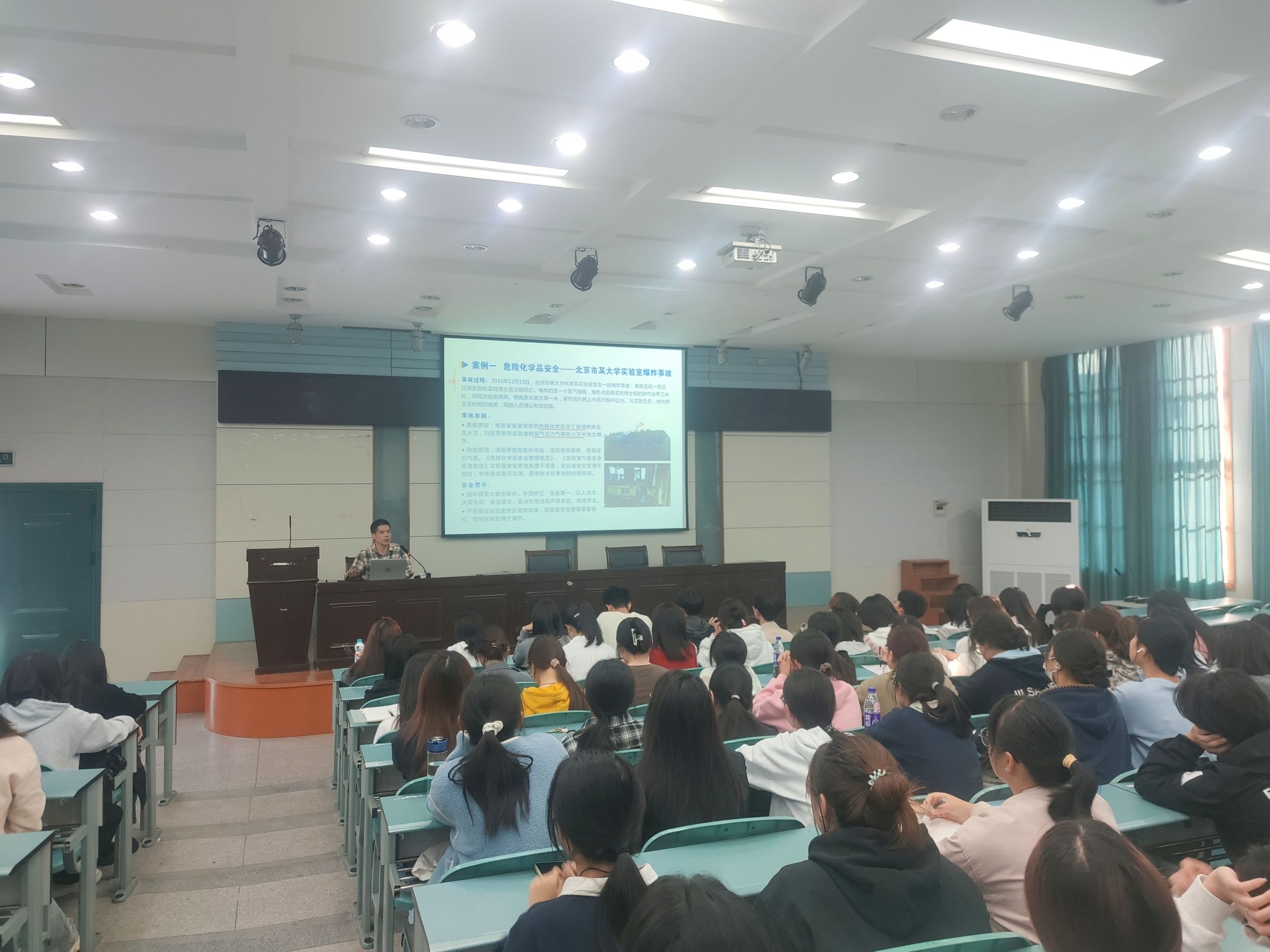 张平究教授首先介绍了近年来高校频发的实验室安全事件,从实际案例出发指出实验室安全管理的重要性和必要性,强调生命安全是实验操作的第一要素;接下来他结合自身的理论知识和实践经验向同学们详细讲解了实验过程中应注意的要素,让在场师生对实验室安全规范、设施设备要求、使用管理要求、储存条件、废弃物的处置、应急要求等方面有了进一步的认识和提高。