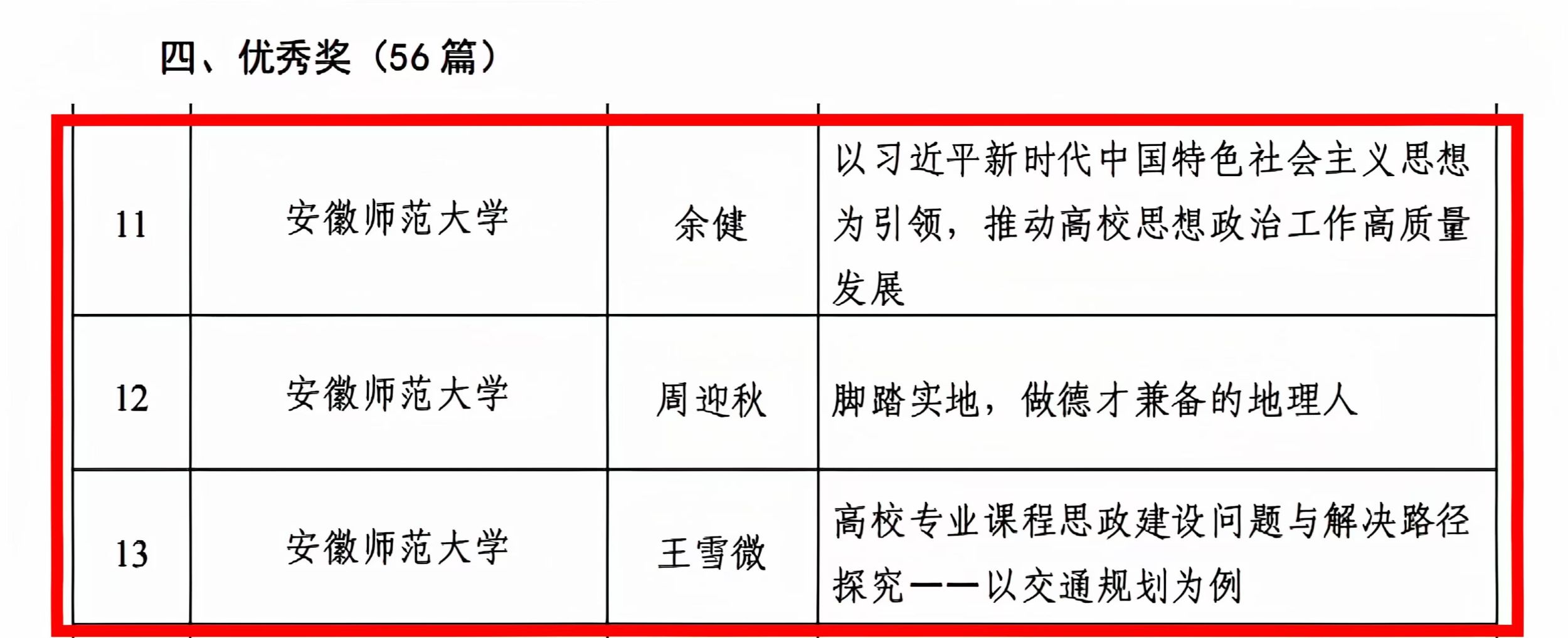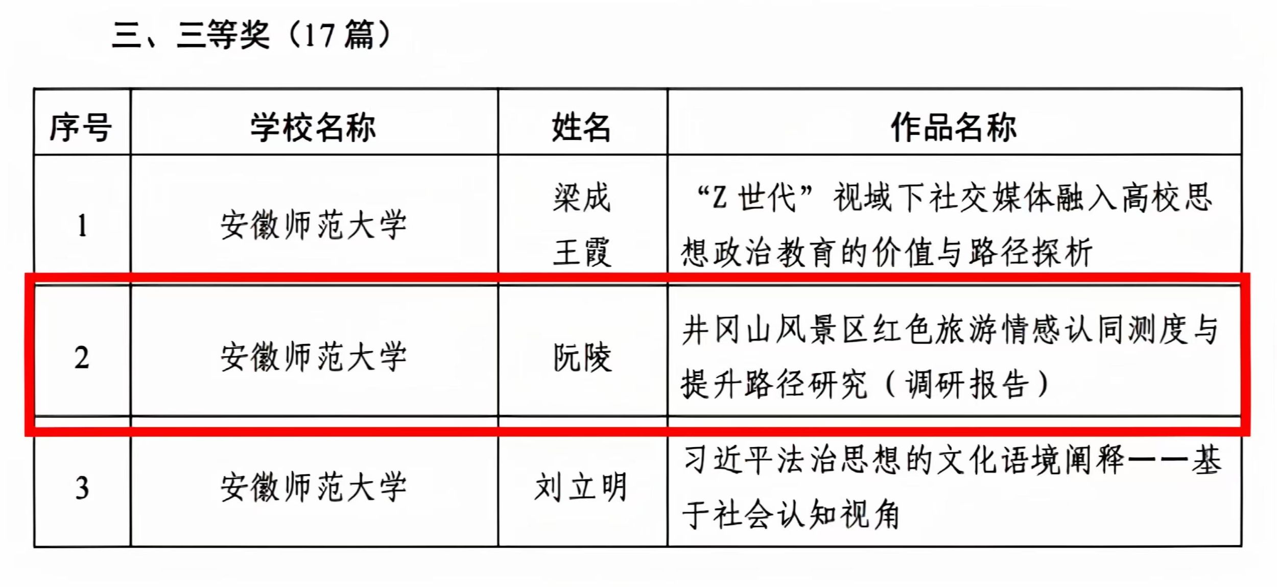 近日,安徽省高校学习贯彻党的二十届三中全会精神征文评选结果揭晓,英国365集团官网喜获佳绩,分别荣获三等奖1项、优秀奖3项。其中,阮陵老师的《井冈山风景区红色旅游情感认同测度与提升路径研究》荣获三等奖;余健老师的《以习近平新时代中国特色社会主义思想为引领,推动高校思想政治工作高质量发展》、周迎秋老师的《脚踏实地,做德才兼备的地理人》和王雪微老师的《高校专业课程思政建设问题与解决路径探究——以交通规划为例》荣获优秀奖。