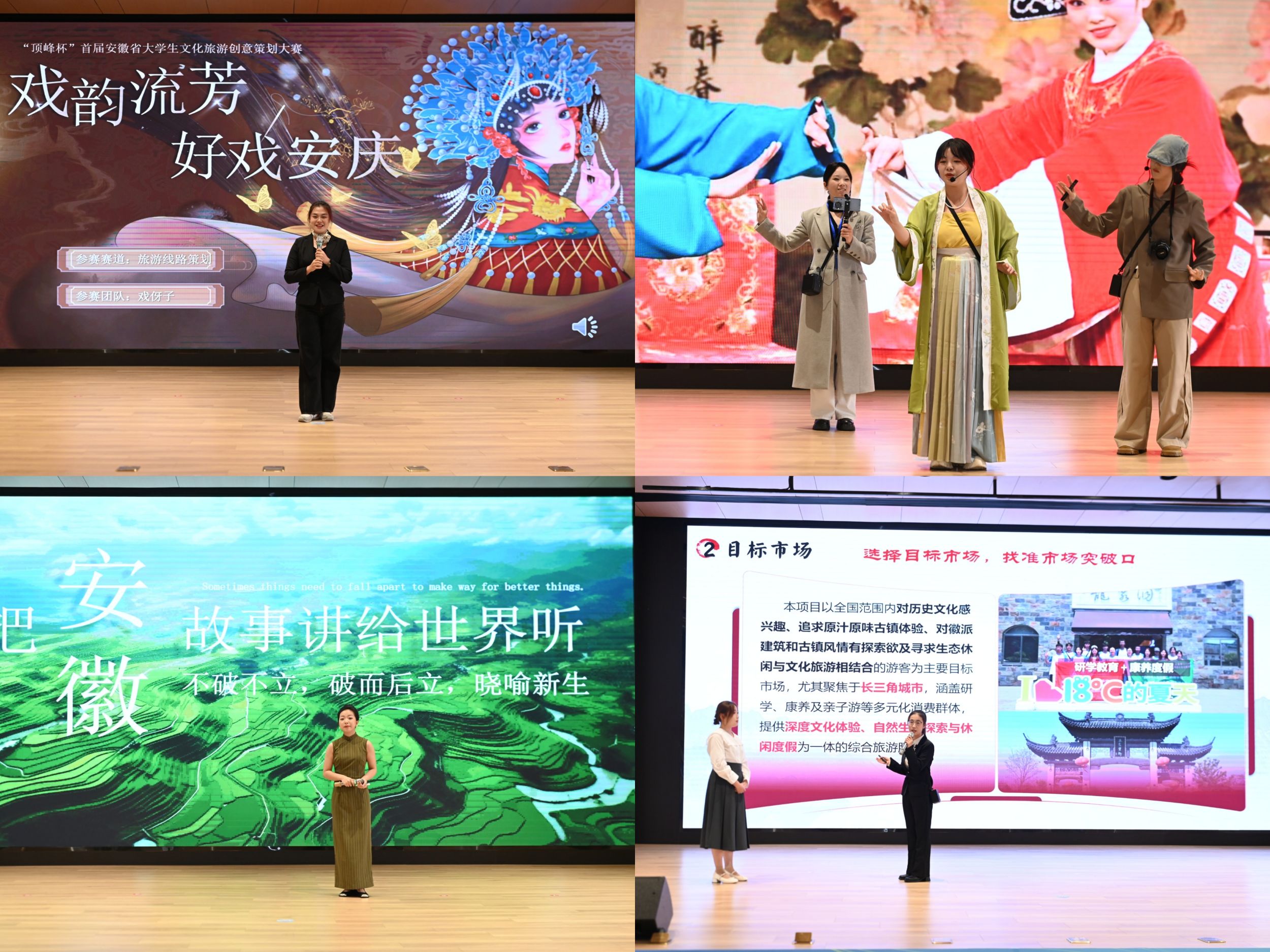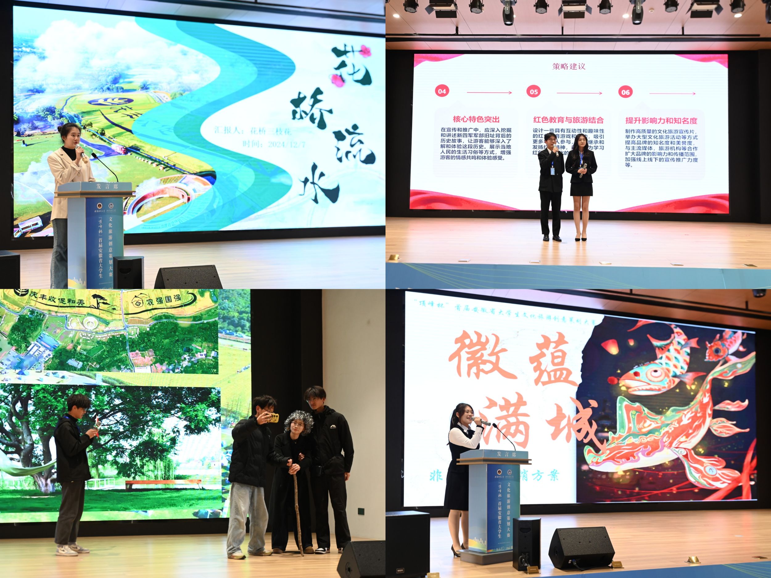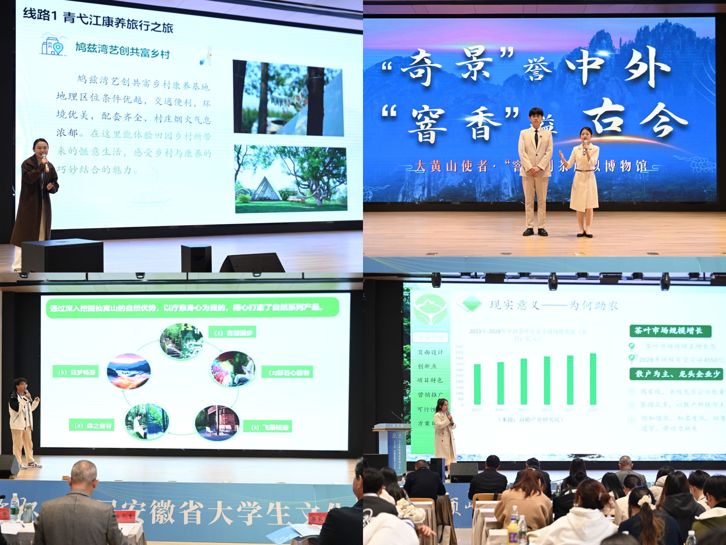 决赛环节,参赛选手依次按照旅游线路策划、主题旅游产品策划、旅游营销策划三个赛道顺序展开汇报。旅游线路策划赛道共有十组选手参加,主题旅游产品策划赛道共有十组选手参加,旅游营销策划赛道共有九组选手参加。参赛选手们围绕安徽省内各地市优秀传统文化、红色文化、旅游特色等基础,通过创意设计,从主题定位、市场分析、创意理念、产品设计、市场营销、财务分析等各个方面展示了自己团队的创意主题,作品充分考虑将传统和现代科技融合、文化和旅游融合、市场和产品对接,具有较强的时代性和可行性。评委老师们结合参赛作品进行即兴提问,参赛员工沉着冷静、条理清晰的回答充分展示了当代老员工对专业知识的应用、对文旅发展的认知探索和文旅策划的无限创意。