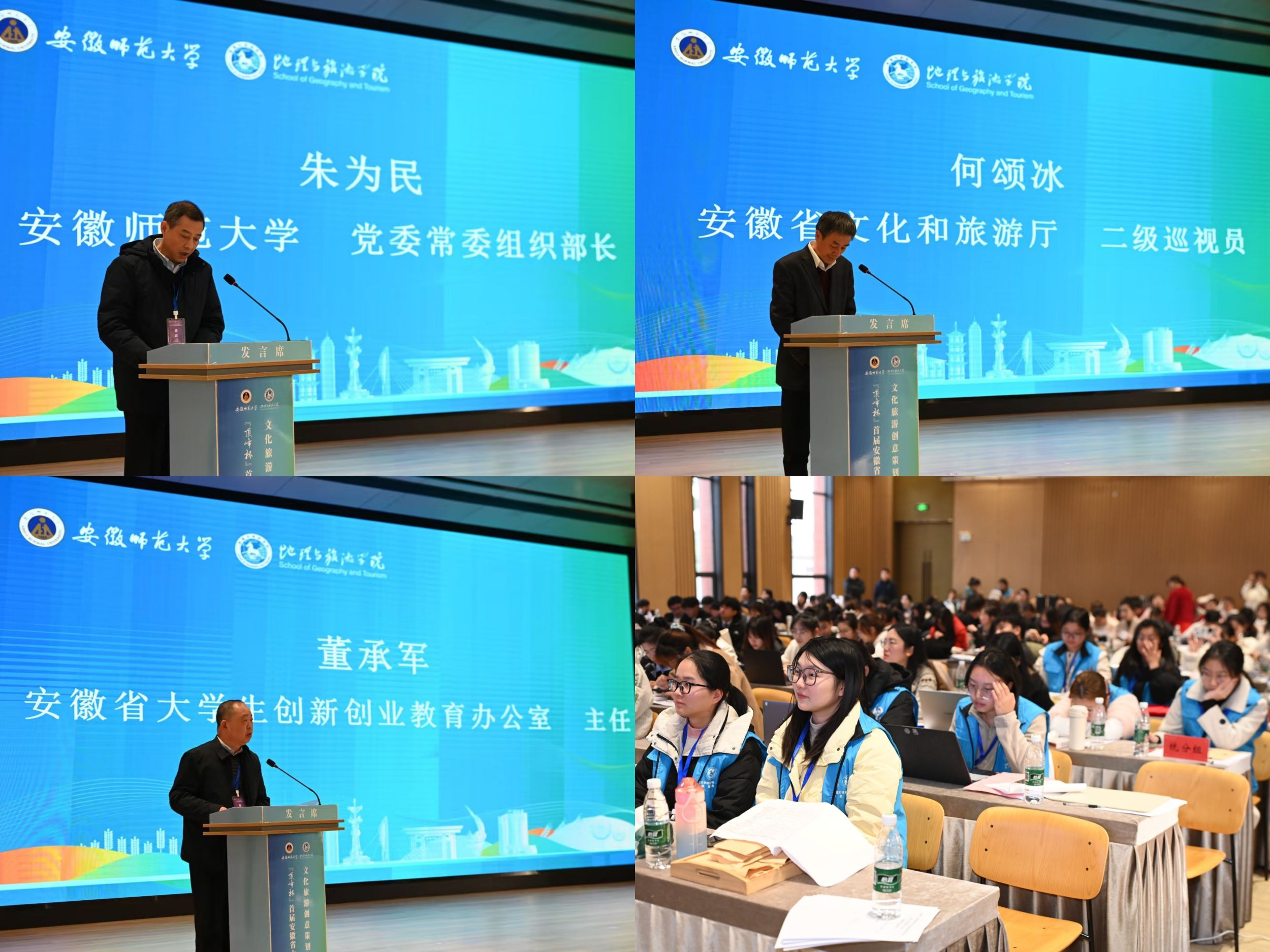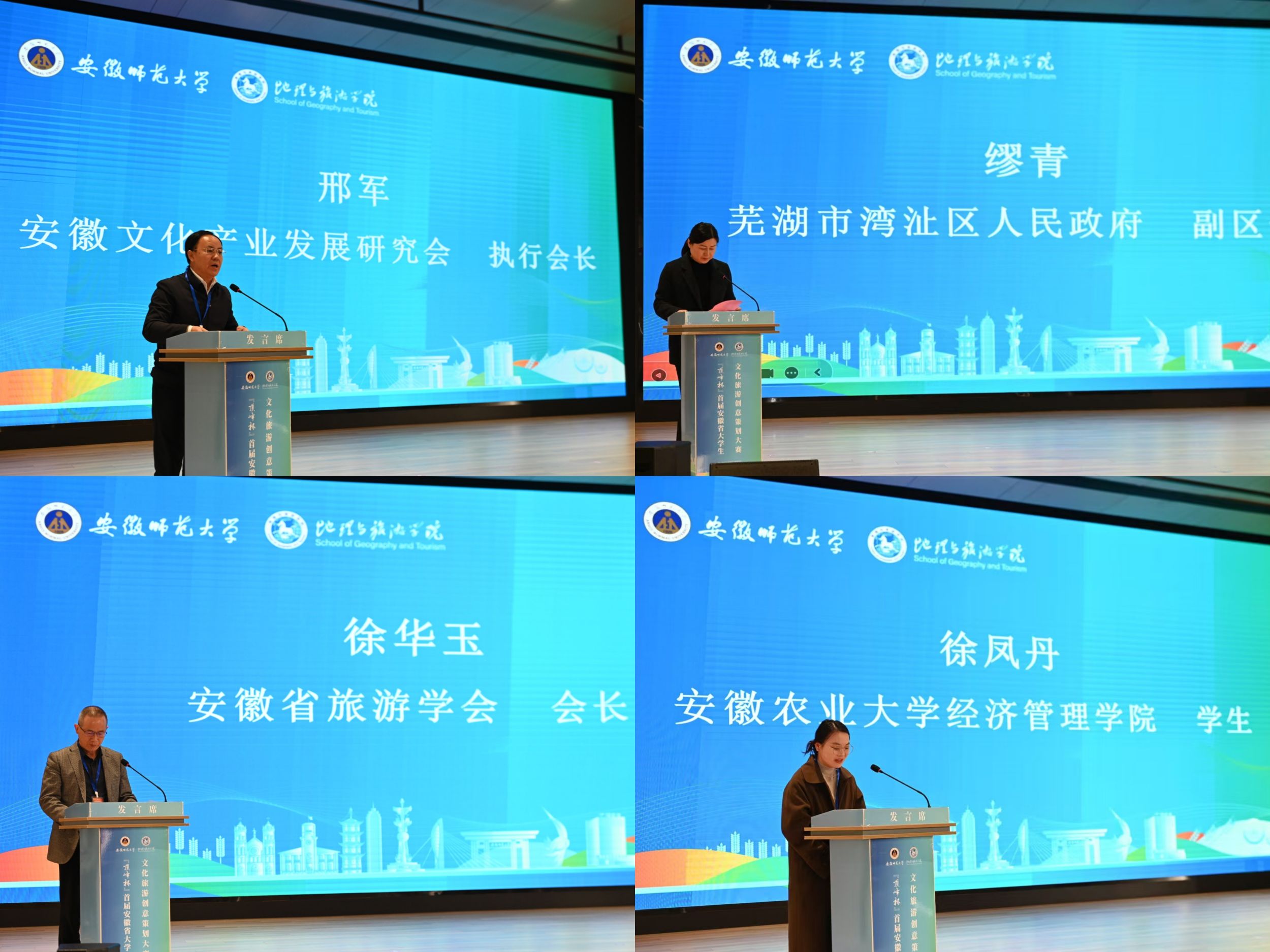 邢军介绍了安徽文化产业发展研究会的基本内容,并表示文旅产业承载国民精神力量与国家软实力,参赛者被寄予厚望,需发挥想象力与创造力,为大众打造多样化、个性化、高品质的文旅产品与服务。缪青表示举办地承载文化传播荣耀,文化与旅游融合助推乡村振兴,与本次大赛初衷契合。徐华玉作为本次大赛评审组组长发表讲话,他先是向参与赛事组织、评审工作的领导、专家以及积极参赛的同学们表达诚挚感谢,随后介绍评审组专家成员的确定和工作要求。参赛团队员工代表、安徽农业大学经济管理公司徐凤丹分享了自己从初赛到决赛的经历与感悟,并代表参赛团队承诺严格履行要求,强调比赛是发现与成长之旅,会全力展示团队风采。