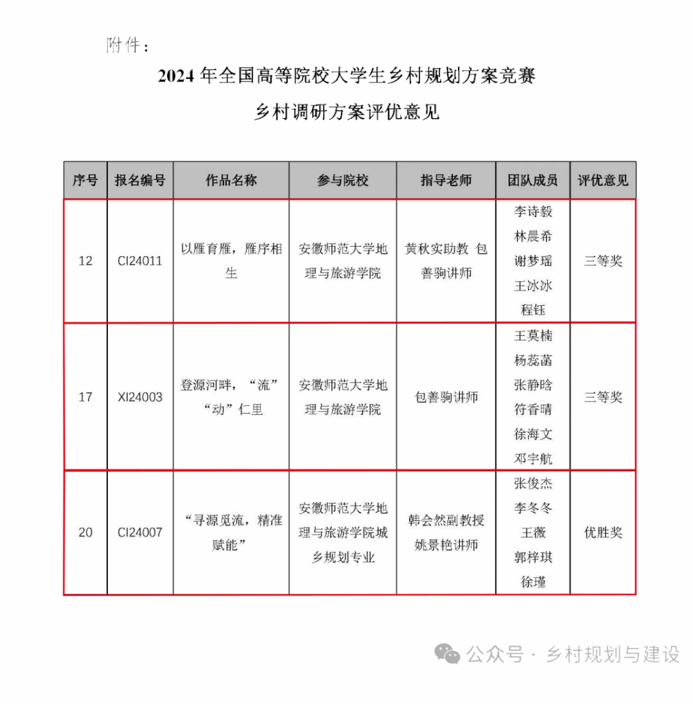 近日,2024年中国城市规划学会乡村规划与建设分会在安徽建筑大学发布了2024年全国高等院校老员工乡村规划方案竞赛拟获奖名单,公司3份作品从全国397份作品中脱颖而出,在乡村调研报告竞赛单元斩获国家级三等奖2项,国家级优胜奖1项。