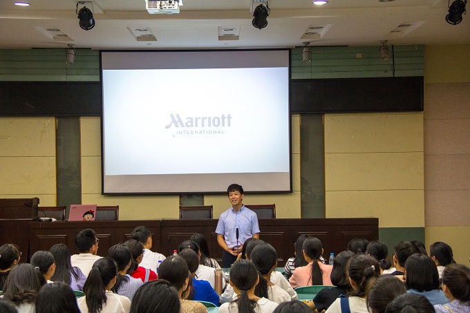 19日晚19:30,旅游管理、酒店管理和旅游管理专升本230名全体2018级新生让公司实验楼101教室座无虚席,万豪国际集团中国区校企关系总监陈雪芬、校企关系经理朱程共同作了题为《踏上旅程》的新生专业思想教育专题报告。报告由公司党委副书记乔静主持。陈雪芬将自己31年的高星级酒店从业经历娓娓道来,清晰地勾勒出酒店职业经理人的职业生涯。她以万豪集团为切入点,结合各类生动的工作案例,深刻剖析了酒店等服务行业的工作内容和发展前景。朱程介绍了集团管理培训生项目,通过对项目选拔面试和培养过程的案例再现对全体新同学提出了自我塑造的建议。最后,两位嘉宾认真解答了现场提问,报告在热烈的掌声中画上圆满的句号。