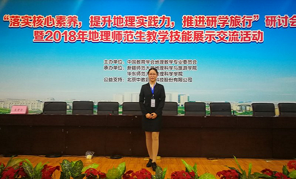 (本网讯 刘学梅、钱程)2018年9月28日至30日,由中国教育学会地理教学专业委员会主办的“第五届高校地理师范生教学技能展示交流活动”在新疆师范大学举行。公司英国365集团官网2015级地理科学(师范)专业解修月和2017级地理学科教学专业代梦云在刘学梅老师带队指导下参赛,双双喜获 “大会示范课”(最高奖项),指导教师刘学梅和李俊峰获得优秀指导教师奖。