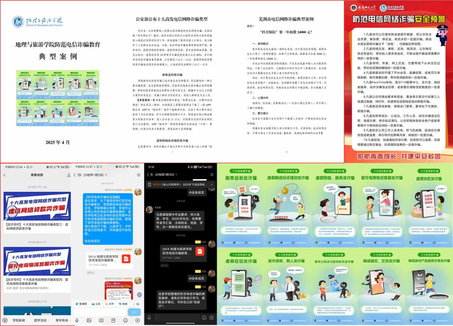 全天候网络宣传,普及反诈防诈安全知识。充分利用微信公众号、班级QQ等新媒体传播速度快、覆盖面广、时效性强等优势,结合同学们长时间上网冲浪的网络原住民特点,编辑整理了公安部和芜湖市高发电信网络诈骗典型案例,设计制作防范电信网络诈骗宣传海报,面向全体员工全天候、分批次进行推送,全覆盖宣传普及反诈防诈知识,教育引导同学们牢固树立“未知链接不点击,陌生来电不轻信,个人信息不透露,转账汇款多合适”的安全意识,压实反诈防诈安全第一责任人,遏制电信网络诈骗蔓延多发易发趋势,不断提高员工识别和应对电信网络诈骗的能力,切实提升宣传教育实效。
