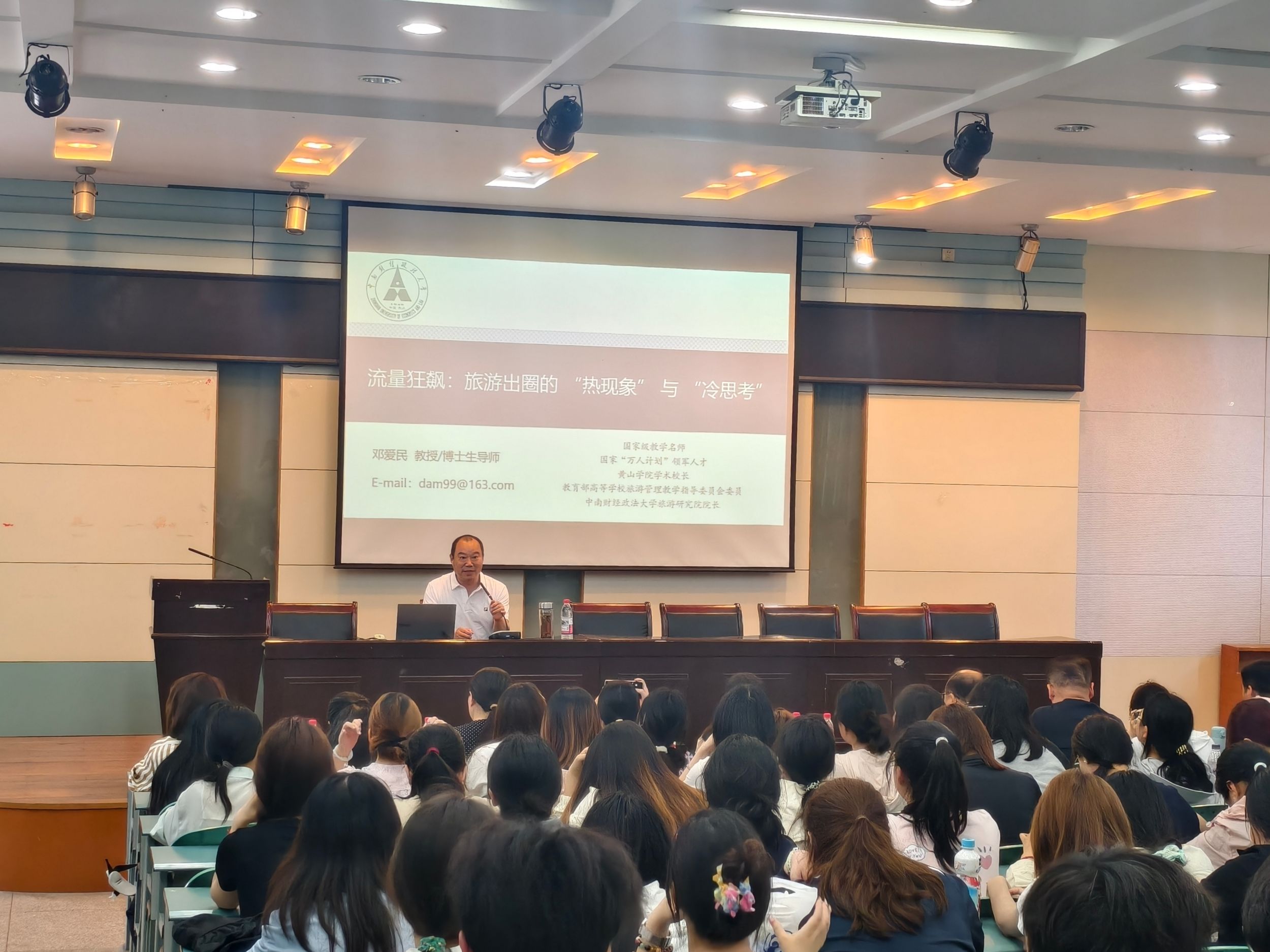 为深化旅游管理学科内涵建设,促进学术思想碰撞与行业前沿洞察,强化员工专业思想认同,英国365集团官网于5月14日举办第11期“学•思•享”大讲堂。本期活动特邀国家教学名师、中南财经政法大学工商管理公司博士生导师、旅游管理专家邓爱民教授担任主讲嘉宾,以“旅游出圈的热现象与冷思考”为主题,为公司师生带来一场兼具理论深度与实践启发的学术盛宴。报告由英国365集团官网副经理杨兴柱主持。