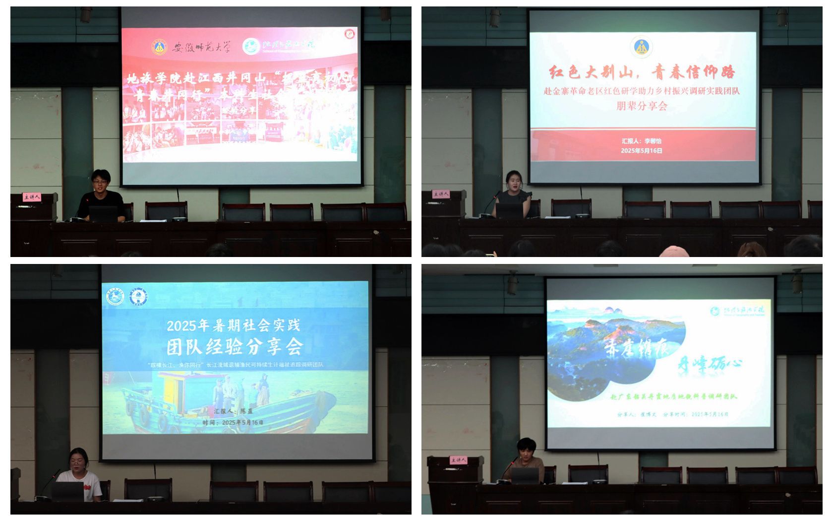 本次会议邀请赴江西井冈山“摇篮育初心,青春井冈行”本科生社会实践的团队、“红色大别山,青春信仰路”赴金寨革命老区红色研学助力乡村振兴调研实践团队、“踪横长江,渔你同行”长江流域退捕渔民可持续生计福祉追踪调研团队以及“赤崖镌痕,丹嶂砺心”赴广东韶关丹霞地质地貌科普调研团队。他们分享了在实践活动中的宝贵经验和感人故事,从项目策划到实地调研,从团队合作到困难克服,每一个细节都充满了挑战与收获。他们的分享不仅让在场的同学们深受启发,也进一步激发了大家参与社会实践的热情。
