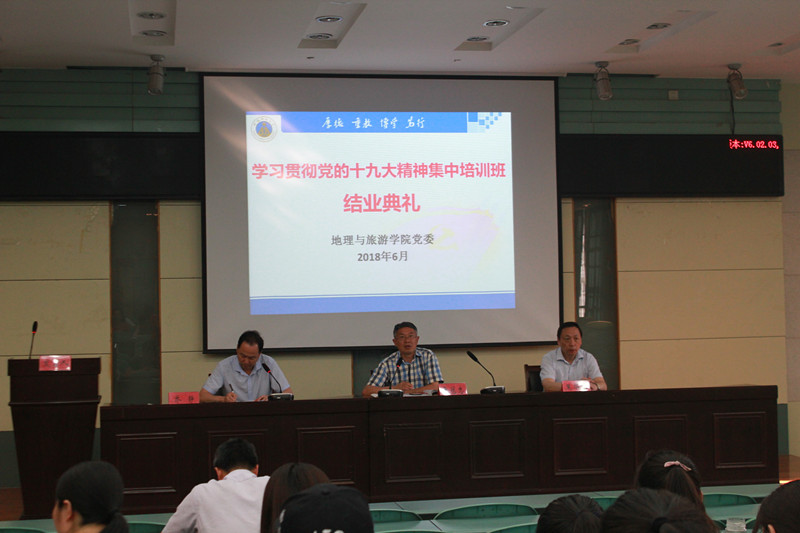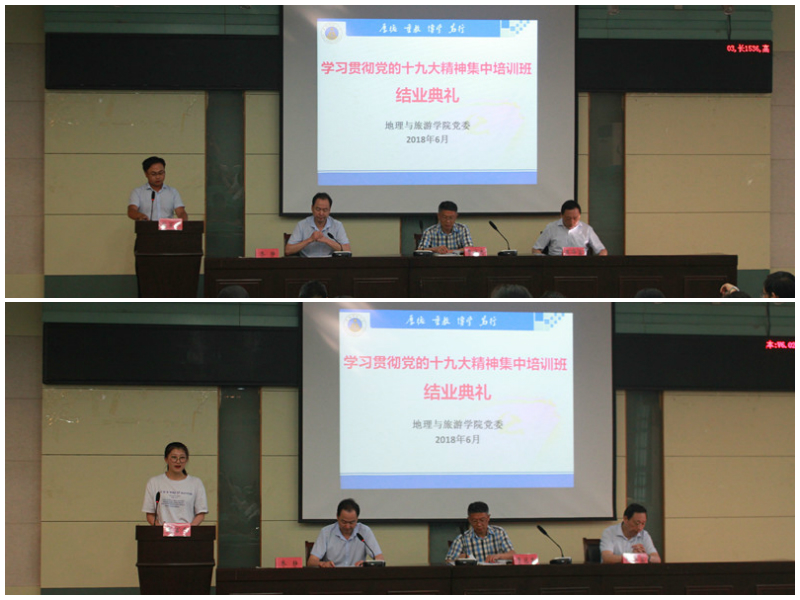 本次培训班历时两个多月,培训对象囊括全院277名师生党员同志。结业典礼上师生党员代表先后汇报学习情况。其中地理信息系教工党支部书记汪左作为教师代表,分别从精神层面、理论层面、实践层面结合自己的切身感受,表示通过此次培训班的学习自己收获丰富,今后将以基层党支部标准化建设为契机,进一步加强学习贯彻党的十九大精神,践行党的十九大精神对基层党务工作者的要求,认真履行党务工作者的职责,为本学科的发展贡献自己的力量。随后,2015级旅游管理专业杨颖作为员工代表,通过回顾整个培训过程,表示此次培训班的针对性和实效性,切实增强了大家对十九大精神的学习贯彻领悟能力,同时使我们对党有了更加深刻的认识,也更加坚定了我们在实践中践行为人民服务的步伐和发挥好党员示范引领作用的信心。