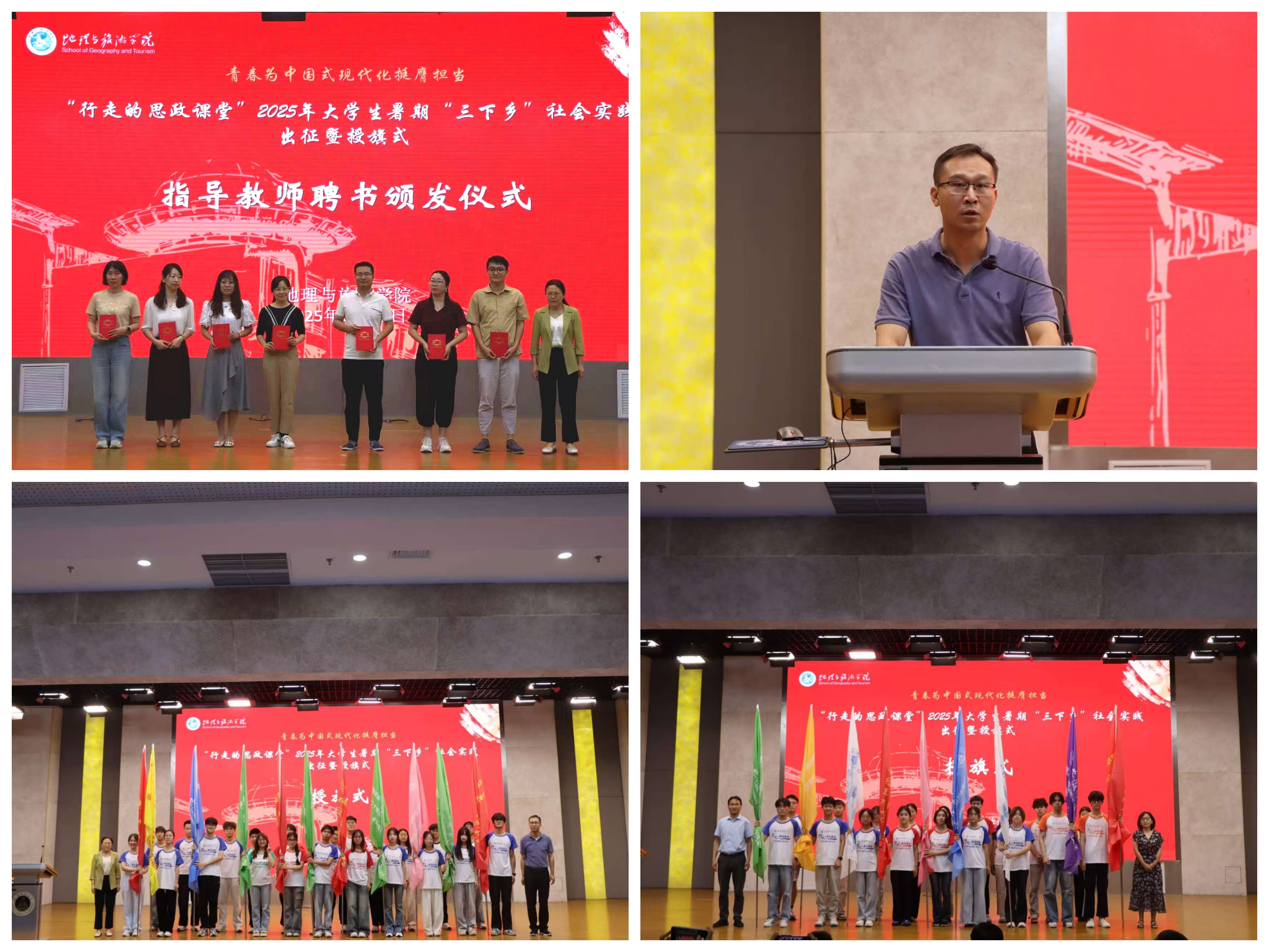 方凤满为暑期社会实践指导教师代表颁发聘书。张顺在动员讲话中指出,同学们要胸怀家国情怀,坚持知行合一,深入基层一线;要严守纪律,团结协作,展现"厚德重教、博学笃行"的学子风采;要珍惜实践机会,在服务社会中成长成才。最后,与会领导为各实践团队授旗,全体人员合影留念。