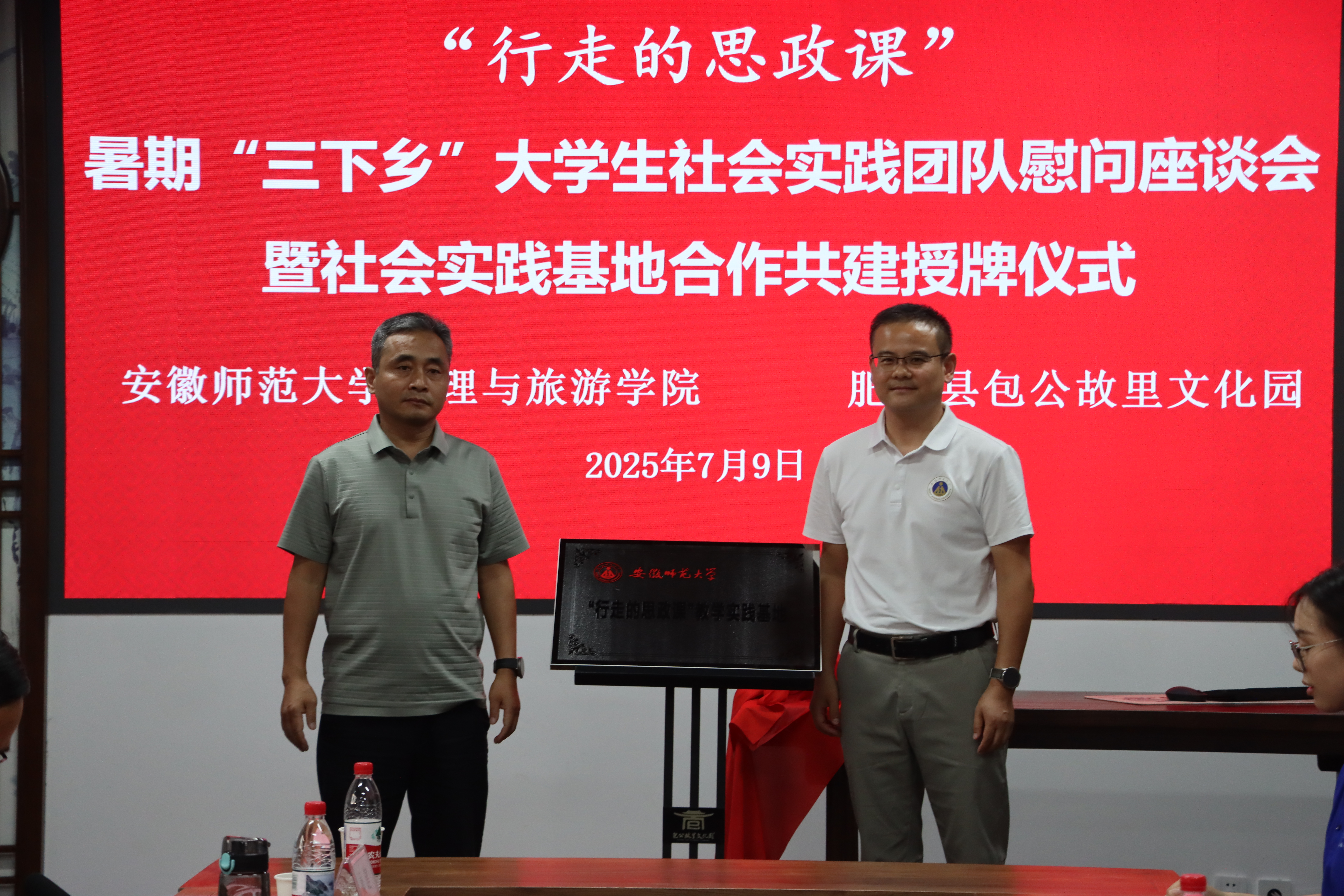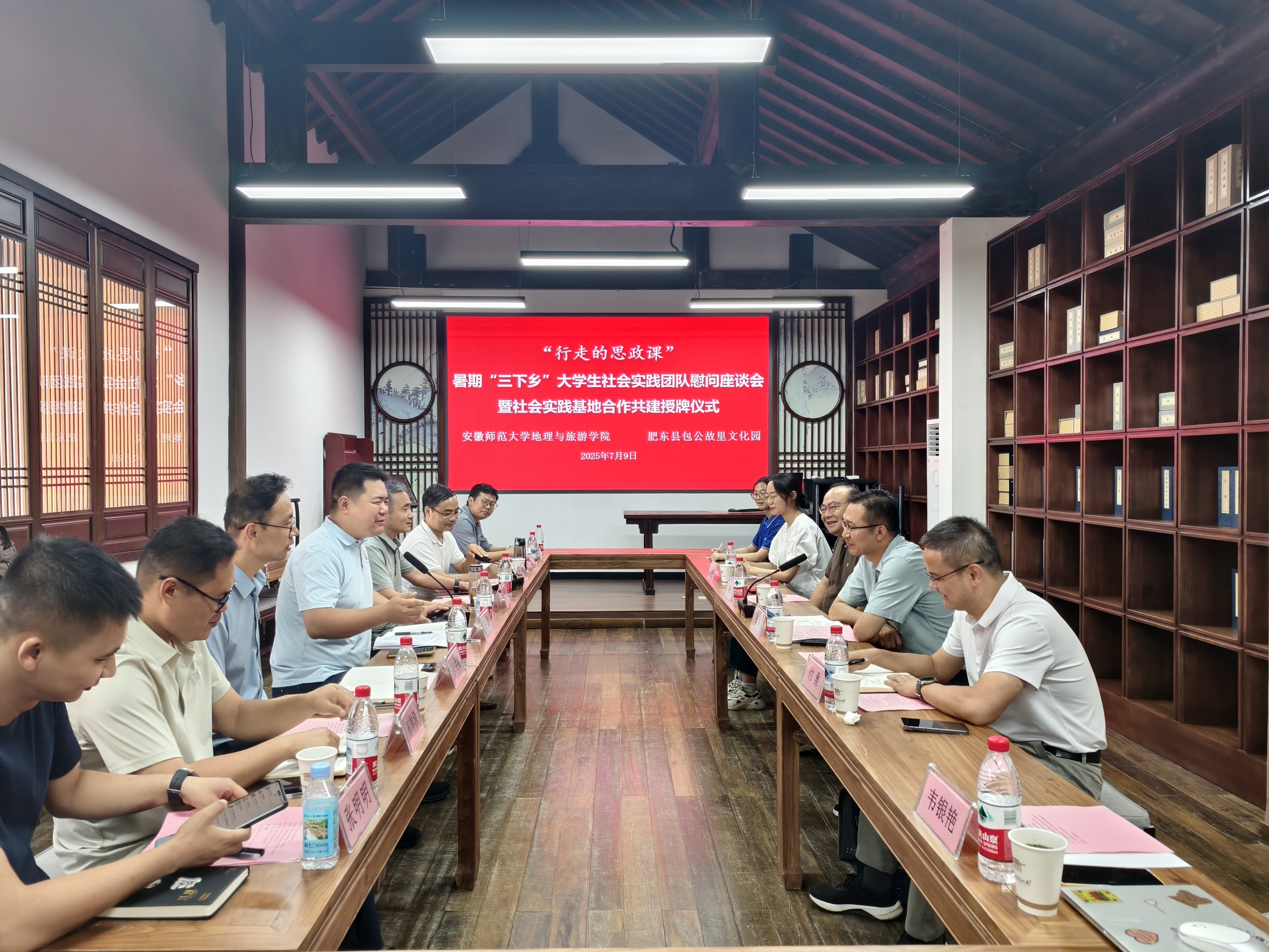 7月9日下午,英国365集团官网公司党委书记张顺、党委副书记付勇、旅游管理专业教师杨钊一行来到包公故里文化园,亲切慰问英国365集团官网赴合肥“正气庐州路,青春信仰行”社会实践团队的全体师生。肥东县包公镇党委书记、公司2014届旅游管理专业员工王磊,党委副书记、公司徐井美,文旅办副主任张燕,合肥东部新城文旅传媒有限公司董事长黄俊华等陪同,并举办英国365集团官网赴合肥“正气庐州路,青春信仰行”社会实践团队慰问座谈会暨社会实践基地合作共建授牌仪式。活动由合肥东部新城文旅传媒有限公司副总经理王家发主持。