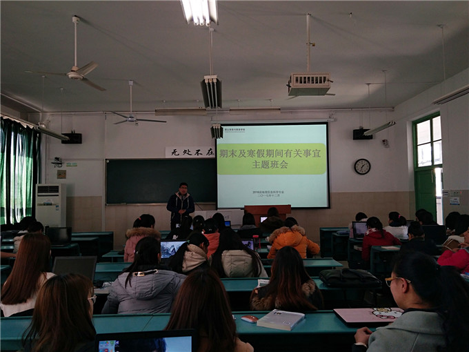 本网讯(国旅公司 周思语) 为加强学风建设,严肃考风考纪,确保同学们可以度过一个平安、愉快的寒假,12月22日正值传统节日“冬至”,2016级地理信息科学专业于下午1:30在教学楼2040501召开期末及寒假期间有关事宜主题班会。班会由辅导员赵将主持,2016级全体同学参加了此次班会。