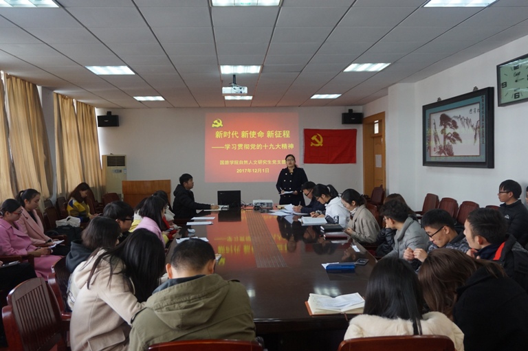 2017年12月1日,国土资源与旅游公司自然人文研究生党支部在国旅公司行政楼三楼开展以“新时代 新使命 新征程——学习贯彻党的十九大精神”为主题的党日活动,本次活动由党支部书记从然老师主持参加并主持。