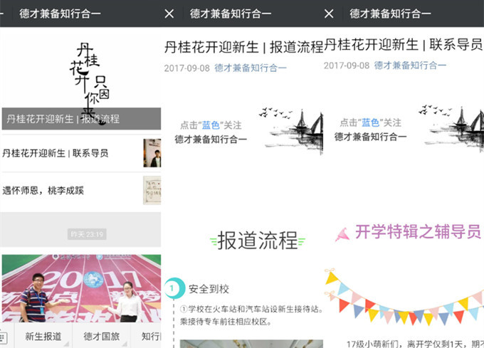 早在新生正式报到之前,国旅公司就发挥新媒体优势,在公司团委的微信公众号“德才兼备 知行合一”中发布了详细的报到流程与2017级辅导员的简介,图文并茂、生动详细,力求以最便捷、最及时的方式为新生入学助力。同时,公司员工会的微博与QQ群也在线上实时为新生提供讯息、答疑解惑。快人一步的线上迎新服务,使得迎新现场更加有条不紊,提高了报到注册的效率。