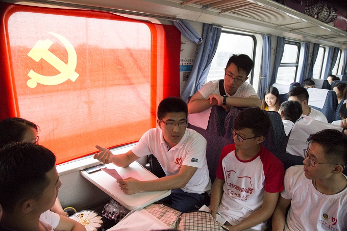 几乎在同一时间,在由安徽合肥开往四川达州的K1157次列车5号车厢里,国旅公司辅导员赵将老师的身边围坐着一群员工党员和积极分子,一面鲜红的党旗悬挂在车窗上,他正在给“情系川皖圆梦巴蜀”山区留守儿童支教团的队员们讲授一堂特别的党课,主题是“心怀家国梦想,拥抱奋斗青春”,而这一支团队也正式踏上了连续第10年赴川支教的征程。“家国梦想是泱泱华夏千百年来优秀青年不懈的追求与坚守,千百年来,无数仁人志士胸怀家国天下,为中华民族的生存发展作出了巨大的贡献和牺牲,以实际行动为我们诠释了家国情怀的内涵要求”,“青春因奋斗而精彩,有了梦想,青春才会闪光,有了奋斗,青春才会飞扬,有了拼搏,青春才会美丽。青春,需要奋斗!只要我们每一位青年老员工拥有奋斗的青春,未来的中国才能真正屹立在世界东方,走向复兴、创造辉煌!”赵将动情地鼓励着在场的同学们。