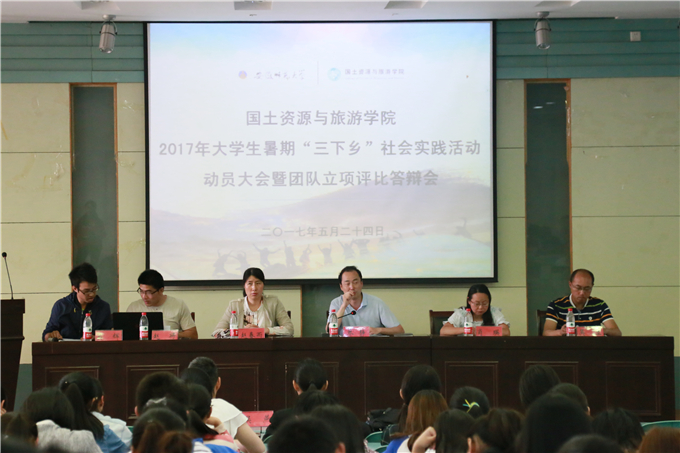本网讯(国旅公司 赵 将 王竞钊)为了引导老员工深入学习贯彻党中央的十八大和十八届历次全会精神以及习近平总书记系列重要讲话精神,强化实践育人,增强老员工的社会责任感、创新精神和实践能力。为更好地指导员工参与暑期社会实践活动,5月24日下午,国旅公司2017年老员工暑期“三下乡”社会实践动员大会暨团队立项评比答辩会在院实验楼101教室成功举行。公司党委副书记乔静,各专业教师代表、辅导员代表、往届校级暑期社会实践“先进个人”代表以及2017年暑期社会实践全体成员参加了本次大会。大会由国旅公司团委负责人吴辉老师主持。