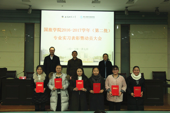 首先,公司党委书记贾冠忠宣读了《关于表彰2013级旅游管理、土地资源管理、地理信息科学第二批专业实习优秀小组、优秀个人和优秀案例的决定》,授予深圳圣廷苑大酒店实习小组等4个实习小组“优秀实习小组”称号;授予黄建煌等11名同学“优秀实习生”称号;刘利华等10名同学撰写的实习案例被评为“优秀案例”。院领导老师向获奖员工代表颁发荣誉证书,并合影留念。