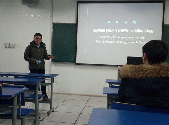 2017年3月2日晚,台湾逢甲大学林圣豪博士应邀在公司实验楼202教室,作了题为“台湾地区不动产持有税与住宅市场的不均衡”的学术讲座。相关专业老师及研究生、本科生聆听了报告。