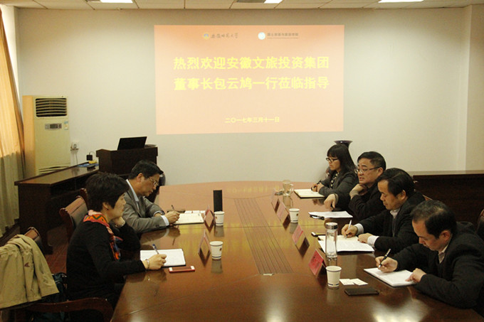 本网讯(国旅公司 吴燕/梁宜人)3月11日下午,安徽文旅投资集团董事长包云鸠一行来公司进行交流访问,在国旅公司行政楼四楼会议室就战略合作进行了座谈交流。经理苏勤、公司党委副书记乔静、副经理赵冬梅出席了本次会议,会议由副经理王朝辉主持。
