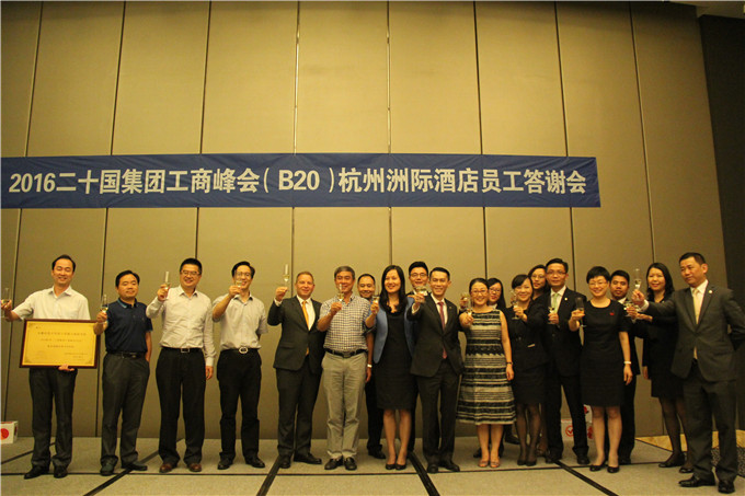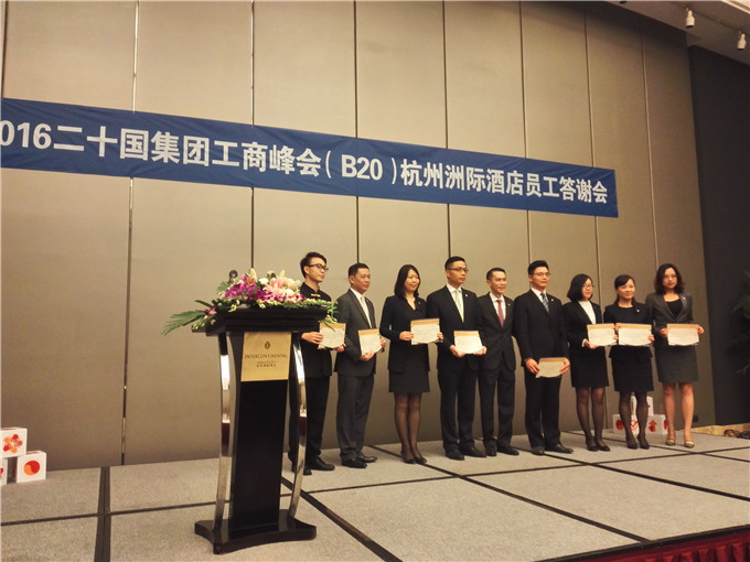本网讯(国旅公司)9月19日下午,2016杭州二十国集团工商峰会(B20)答谢会在杭州洲际酒店新闻发布厅举行,公司被授予二十国集团工商峰会(B20)服务保障优秀合作院校称号,公司党委常委、副董事长朱家存代表公司受邀参会并接受牌匾,杭州市钱江新城投资集团党委书记、董事长朱云夫,杭州国际会议中心总经理陈晓,洲际集团大中华区东区运营总监Daniel Arbenz,杭州洲际酒店总经理Frankson Lee,B20保障合作单位、院校领导等出席大会。