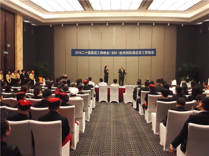 杭州国际会议中心、洲际酒店是本次B20峰会开幕式、会议及晚宴的承办方,杭州洲际酒店是G20峰会官方指定接待酒店。公司作为杭州国际会议中心、洲际酒店的校企合作单位,早在2015年12月,就配合峰会组委会和承办方开展了员工服务团队的招募、培训工作,16位同学通过层层筛选,在半年多的时间里接受了组委会高强度的培训,圆满完成了峰会服务工作。答谢会上,Frankson lee代表峰会承办方对公司的人才培养质量予以高度肯定,并对公司在峰会筹办期间的大力支持及对参与服务同学们的辛勤付出表示衷心感谢;朱云夫在会上以“记得、值得、懂得”三个关键词回顾了峰会筹办的艰辛历程,并引用习近平总书记在五四青年节纪念活动上关于“青春”的寄语勉励同学们,要把服务B20峰会的宝贵经历作为人生财富激励自己努力前行;陈晓代表峰会承办方为公司颁发了荣誉牌匾。