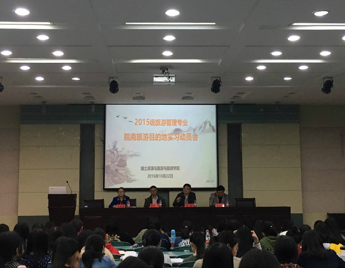 本网讯(国旅公司 郭雨琪)10月22日下午,2015级旅游管理专业皖南旅游目的地实习动员大会在国旅公司实验楼101教室召开。党委书记贾冠忠、经理苏勤、教学副经理方凤满、专业负责人杨效忠、指导老师钱璐、辅导员吴燕以及2015级旅游管理专业全体员工参加了此次会议。校科研处处长陆林给员工作黄山地区综合实习指导讲座。