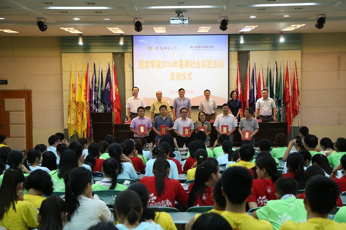 本网讯(国旅公司 吴辉、梁宜人)青春建功十三五,携手共筑中国梦。7月2日下午,国土资源与旅游公司2016年老员工暑期“三下乡”社会实践活动启动暨授旗仪式在院实验楼101报告厅举行。校团委书记梁燕,公司党委书记贾冠忠,经理苏勤,公司党委副书记乔静,院关工委常务副主任陈仁钧,院社会实践思政指导教师李晓明,院暑期社会实践团队指导老师代表,全体专兼职辅导员列席参会。暑期社会实践团队队员代表近300人参加了仪式,仪式由公司党委副书记乔静主持。