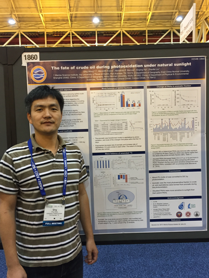 据悉,本次会议共设12个学科分会场,1600多场口头报告和3300多份海报展示,来自各国4000余名专家学者就共同关心的科学问题进行了充分深入的学术探讨和交流。汪青副教授在人类利用和影响(Human use and impacts)分会场展示了题为《自然光照下光氧化对原油归宿的影响(The fate of crude oil during photooxidation under natural sunlight)》的海报,受到相关领域各国专家学者的广泛关注和良好评价。