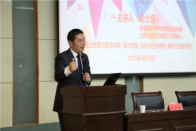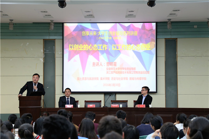 本网讯(国旅公司 孟孟 吴辉) 3月30日下午14:30,由员工办和校就业创业指导中心主办,国旅公司、美术公司、历社公司、新传公司等联合承办的 “创享未来·老员工创业辅导系列讲座”在花津校区国旅公司实验楼举行。上海勺远实业有限公司的创始人、国旅公司2007届员工俞士耀携手浙江葫芦娃网络技术有限公司常务副总经理、国旅公司2010届员工曹明星及其合伙人李平出席本次活动。国旅公司专业教师、各年级辅导员以及来自四个公司的近两百名本科生聆听了优秀员工的精彩演讲,活动由国旅公司经理苏勤主持。