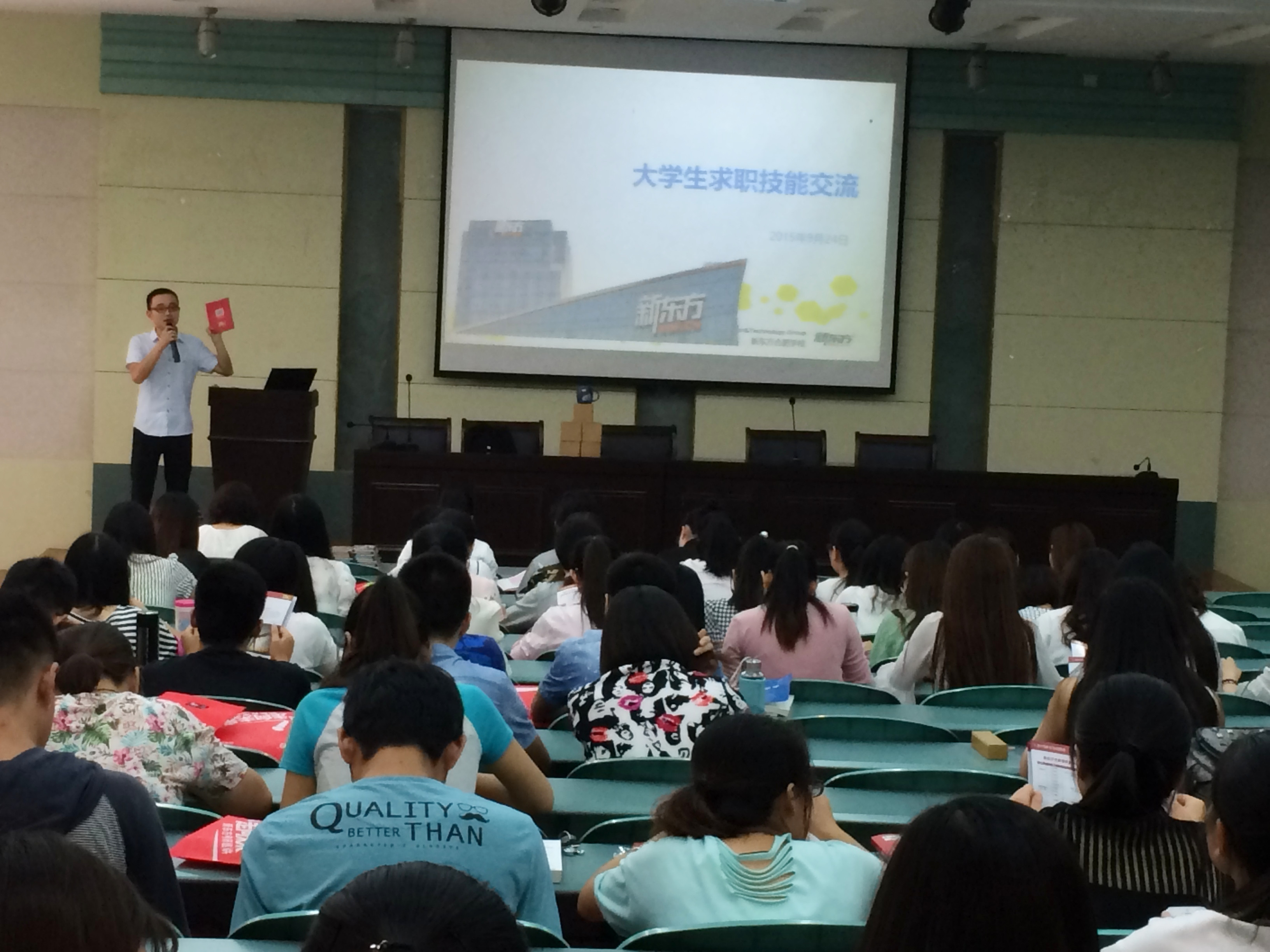 本网讯(国旅公司 徐明露)职旅天下早扬帆,推进就业善作为。9月24日,国旅公司邀请新东方教育科技集团(合肥公司)人力资源总监随从标先生一行来校举办本学期公司首场校园就业宣讲会,该院2016届全体毕业班辅导员和员工参加了宣讲会。