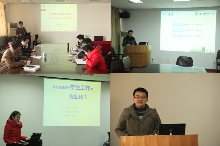 本期“学工沙龙”以提升辅导员职业基础能力为目标,采取全员参与、专题汇报、互动讨论、案例征集等形式,紧紧围绕高校员工管理等专题开展交流分享。2014级专职辅导员李小文总结梳理了公司2015年员工管理主要工作和各节点注意事项,为新学年的员工工作积极建言献策;2013级兼职辅导员吴辉精心介绍了国内外大公司园文化活动的优秀典型案例,拓宽了与会辅导员的工作眼界及思路;2012级兼职辅导员徐明露以“让青春在党旗下成长——高校员工党建工作的思考”为题,带领学工队伍共同学习了国内先进高校员工党建的特色做法,强调了新形势下高校员工党建工作的极端重要性。随后,各年级其他专兼职辅导员也分别围绕“国际化视野下高校学风建设”、“微时代下高校新闻传播工作研究”、“高校员工管理工作专业化经验与举措”、“公司特色团学活动纵览”等专题展开了深入交流和学习。