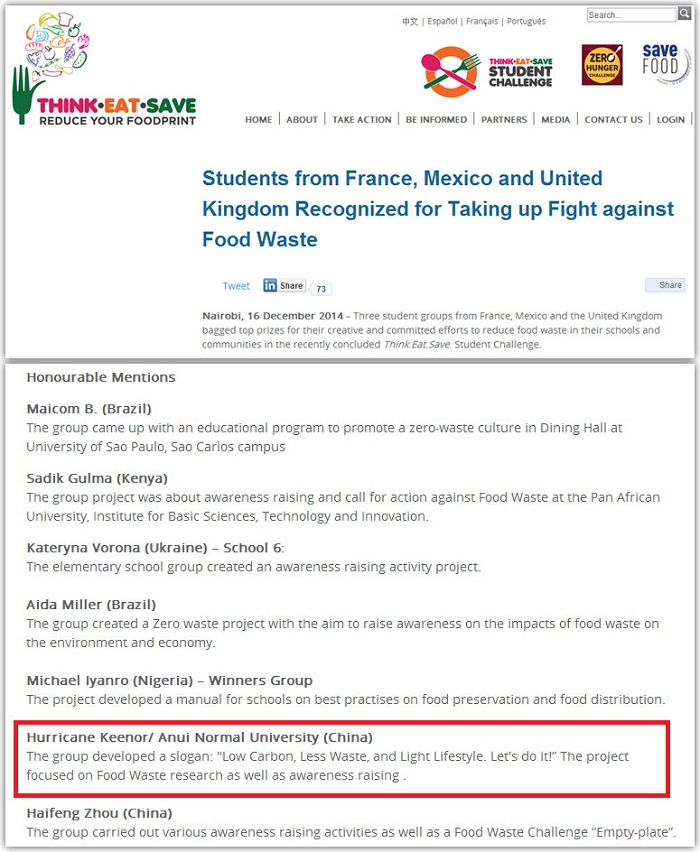 本网讯(国旅公司 张鑫 徐明露)近日,联合国环境规划署“思前·食后·厉行节约”员工挑战活动组委会公布比赛结果,由公司土地资源管理专业2012级本科生舒心同学领衔组建的“L4”团队勇摘荣誉提名奖(Honourable Mentions),全球仅7支团队受此殊荣,来自法国的“What The Food”团队荣膺该项赛事冠军,其他奖项被英国、墨西哥、巴西、肯尼亚等国家的团队摘得。