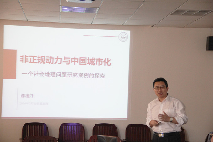 2014年5月30日下午,中山大学地理科学与规划公司薛德升教授在国旅公司三楼会议室作了题为“非正规动力与中国城市化:一个社会地理问题研究案例的探索”的学术报告。相关专业的教师、研究生聆听了报告。