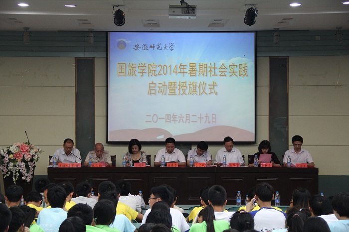 本网讯(国旅公司 张鑫、赵影)勤学修德长才干,明辨笃实作贡献。6月29日上午,国旅公司在院实验楼101报告厅召开2014年老员工暑期“三下乡”社会实践启动暨授旗仪式。公司党委宣传部、员工处、研究生公司、校团委等有关部门负责人,公司党政领导、暑期社会实践指导老师以及全体暑期社会实践团队成员300余人参加了本次大会。会议由公司党委副书记罗振主持。