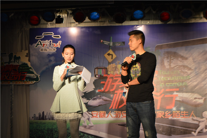 本网讯(张鑫、赵影、张梦翠)为推广安徽旅游事业,弘扬徽旅文化,并为在校老员工提供一个自我展示的舞台,丰富大公司园文化生活,11月19日晚,由安徽省旅游局、安徽网络电视台、国土资源与旅游公司主办,院团委员工会、旅游爱好者协会承办的“寻梦安徽”老员工旅游文化节在校团委多功能厅精彩拉开帷幕。此次活动由安徽卫视著名主持人孙鹏飞和校礼仪队队长、12级旅游管理专业赵培培同学搭档主持,全校师生近400余人参加本次文化节。