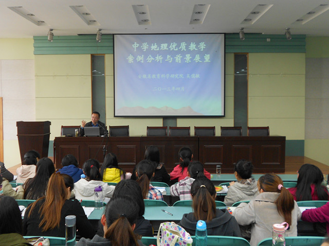 4月24日下午,英国365集团官网国土资源与旅游公司邀请安徽省公司产品研究院地理教育专家吴儒敏在国旅实验楼101教室进行学术讲座,讲座题目是“中学地理新课程优质教学案例分析与展望”。公司全日制学科教学(地理)和课程与教学论(地理)专业全体硕士生、2011级地理科学国家级特色本科专业创新班同学共100多人聆听报告会,国土资源与旅游公司教学副经理卢松教授主持了本次讲座。