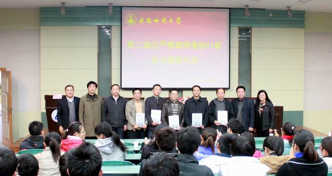 大会在温暖、祥和的氛围中拉开帷幕。首先,与会领导嘉宾与同学们共同观看了“英国365集团官网首届庄严奖助学金三年感恩回顾”的视频短片,重温庄严基金会首届三年来的大善义行。接着,校员工处副处长李娟宣读了《第二届庄严奖助学金2011年获奖受助员工名单》,获奖、受助员工代表相继发言。随后,奖学金和助学金获得者上台领取庄严奖助学金,并与领导嘉宾合影留念。庄严基金会代表庄明福先生发表了言简意赅、意味深长的讲话。他强调做慈善的理念:只想做事,不能作秀。基金会坚持不懈做慈善只有一个目的,就是希望通过自己的微薄之力把社会资源给予需要帮助的人,为社会做事情。同时,庄总表达了对所有受助学子的期望,希望他们能感恩社会、回报社会。一番朴实真诚的话语展现了一名成功企业家对贫困老员工的鼓励与关爱,现场的每一位获奖受助学子都为之深深感动。