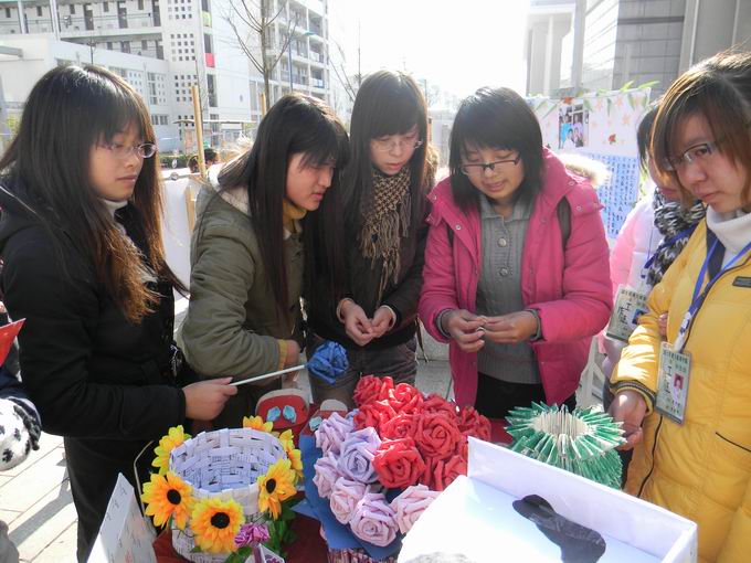 此次成果展主要以展板及手工艺品向广大师生展示公司第六届寝室文化节成果。作品内容丰富、形式多样,其中有可爱的“海宝”展板,五颜六色的瓜子拼成的兔子,大米、绿豆拼成的“斯人轩”,彩纸折成的玫瑰花、菠萝等等。精美的展板和手工艺品吸引了很多同学驻足欣赏,他们纷纷称赞展品新意十足。