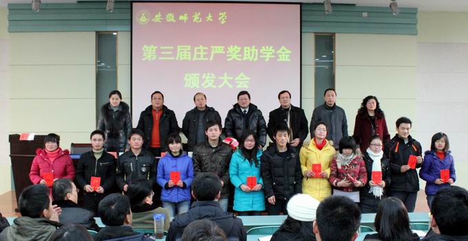 会上,员工处副处长李娟首先宣布了《关于向朱娟等90名同学颁发第三届庄严奖助学金的决定》,获奖和受助员工代表相继发言。随后,庄严基金会代表庄明福先生发表了言简意赅的讲话,表达他对公司的衷心感谢和进一步做好庄严奖助学金的承诺,并希望获奖受助学子能努力学习,将爱心的种子传播下去,将来为社会多做贡献。校员工处处长余国升在发言中高度肯定了庄严基金会的善举所取得的效果,同时希望广大贫困员工要正视现实,接受挑战,做生活的强者;要勤奋学习,勇于实践,做成才的勇者;要学会感恩,甘于奉献,做爱心的使者。最后,与会领导和嘉宾分别向获得本届庄严奖助学金的员工颁发了证书和奖助学金。