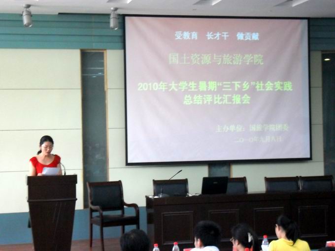 院团委书记施华转老师首先对该院2010年暑期社会实践活动的总体情况做了简要概括,并介绍了奖项设置和具体评分细则。随后,来自公司2008、2009级各专业的20支重点实践团队依次汇报了实践开展情况。抑扬顿挫的演讲、精美的PPT、悠扬的背景音乐为本次汇报增添了光彩!汇报现场,公司学子们在祖国的大好河山上挥洒的泪水和汗水,感动了我们在场的每一个人。有的不顾环境的恶劣奔赴四川支教,为那里的孩子们送上了宝贵的精神财富;有的走进敬老院,为老人们送去了温暖与关怀;小岗村里留下了他们坚毅的脚步;世博会同样也见证了他们的激情与豪迈……同时,他们的事迹也引起了各大媒体的关注与报道。